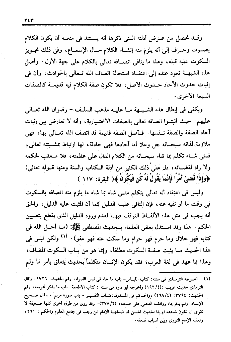 وليس في اعتقاد أنه تعالى يتكلم متى شاء بما شاء ما يلزم منه اتصافه بالسكوت في وقت ما أو نفيه عنه، فإن النافى عليه الدليل كما أن المثبت عليه الدليل، والحق أنه يجب في مثل هذه الألفاظ التوقف فيها لعدم ورود الدليل الذي يقطع بتعيين الحكم. هذا وقد استدل بعض العلماء بحديث المصطفى - صلى الله عليه وسلم -: (ما أحل الله في كتابه فهو حلال وما حرم فهو حرام وما سكت عنه فهو عفو). (١) ولكن ليس في هذا الحديث ما يثبت صفة السكوت مطلقًا، وإنما هو من باب السكوت المضاف، وهذا مما عهد في لغة العرب؛ فقد يكون الإنسان متكلمًا بحديث يتعلق بأمر ما ولم