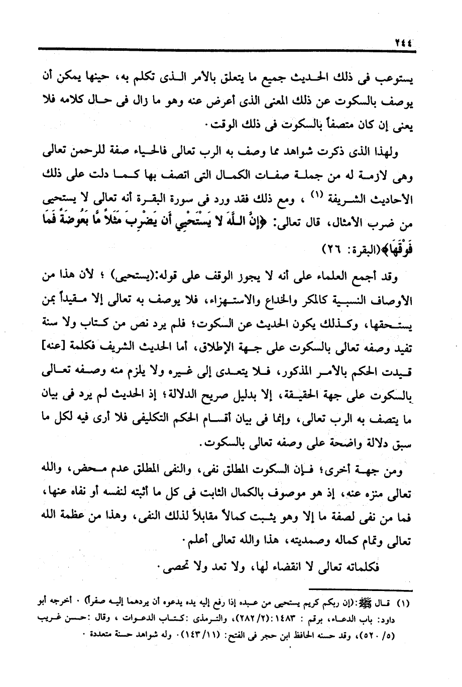 وقد أجمع العلماء على أنه لا يجوز الوقف على قوله: (يستحيى)؛ لأن هذا من الأوصاف النسبية كالمكر والخداع والاستهزاء، فلا يوصف به تعالى إلا مقيدًا بمن يستحقها، وكذلك يكون الحديث عن السكوت؛ فلم يرد نص من كتاب ولا سنة تفيد وصفه تعالى بالسكوت على جهة الإطلاق، أما الحديث الشريف فكلمة [عنه] قيدت الحكم بالأمر المذكور، فلا يتعدى إلى غيره ولا يلزم منه وصفه تعالى بالسكوت على جهة الحقيقة، إلا بدليل صريح الدلالة؛ إذ الحديث لم يرد في بيان ما يتصف به الرب تعالى، وإنما في بيان أقسام الحكم التكليفى فلا أرى فيه لكل ما سبق دلالة واضحة على وصفه تعالى بالسكوت.