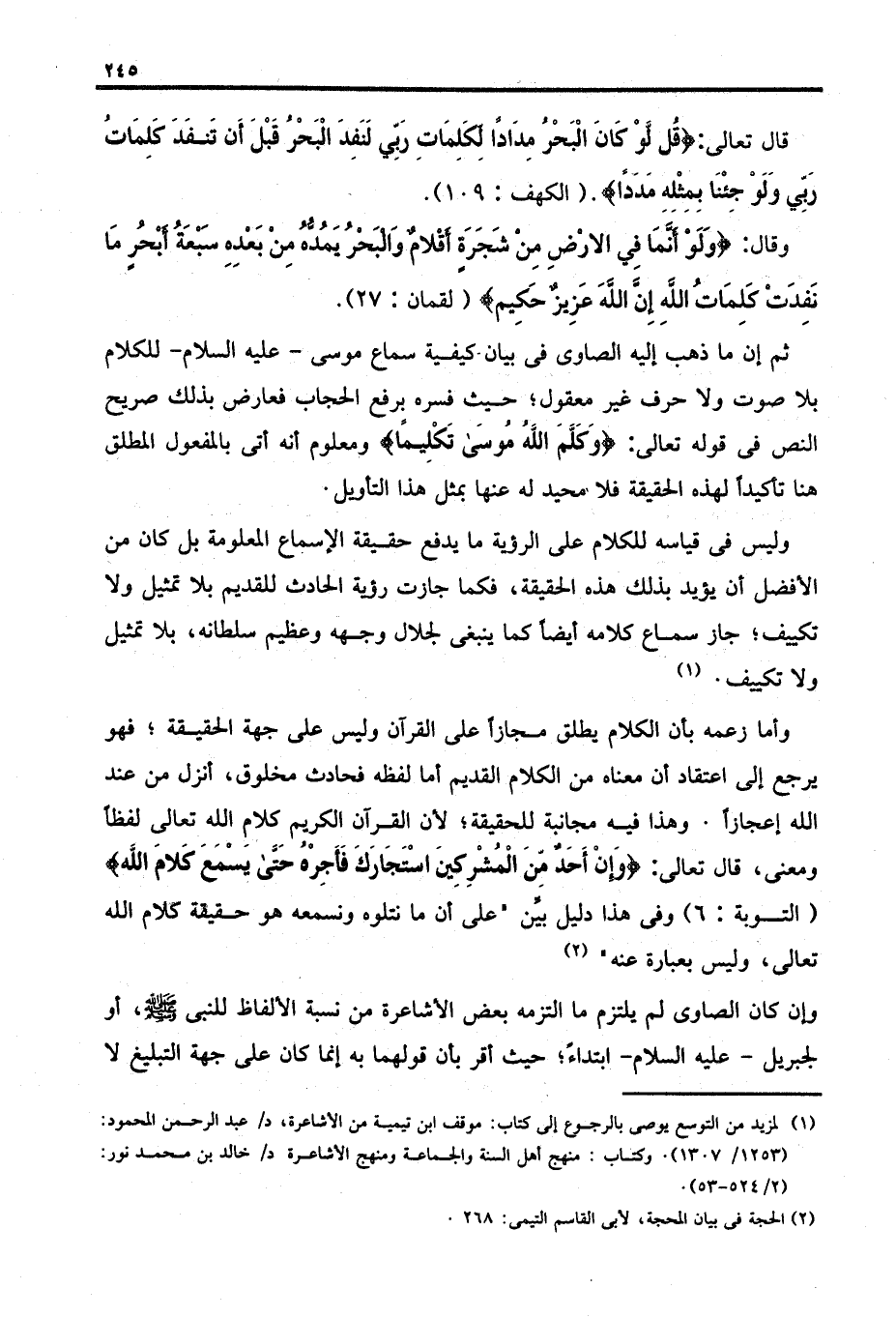 وليس في قياسه للكلام على الرؤية ما يدفع حقيقة الإسماع المعلومة بل كان من الأفضل أن يؤيد بذلك هذه الحقيقة، فكما جازت رؤية الحادث للقديم بلا تمثيل ولا تكييف؛ جاز سماع كلامه أيضًا كما ينبغى لجلال وجهه وعظيم سلطانه، بلا تمثيل ولا تكييف. (١)