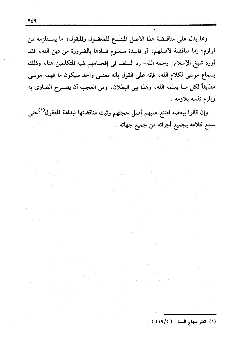 ومما يدل على مناقضة هذا الأصل المبتدع للمعقول والمنقول، ما يستلزمه من لوازم؛ إما مناقضة لأصلهم، أو فاسدة معلوم فسادها بالضرورة من دين الله، فقد أورد شيخ الإسلام - رحمه الله - رد السلف في إفحامهم شبه المتكلمين هنا، وذلك بسماع موسى لكلام الله، فإنه على القول بأنه معنى واحد سيكون ما فهمه موسى مطابقًا لكل ما يعلمه الله، وهذا بين البطلان، ومن العجب أن يصرح الصاوي به ويلزم نفسه بلازمه.