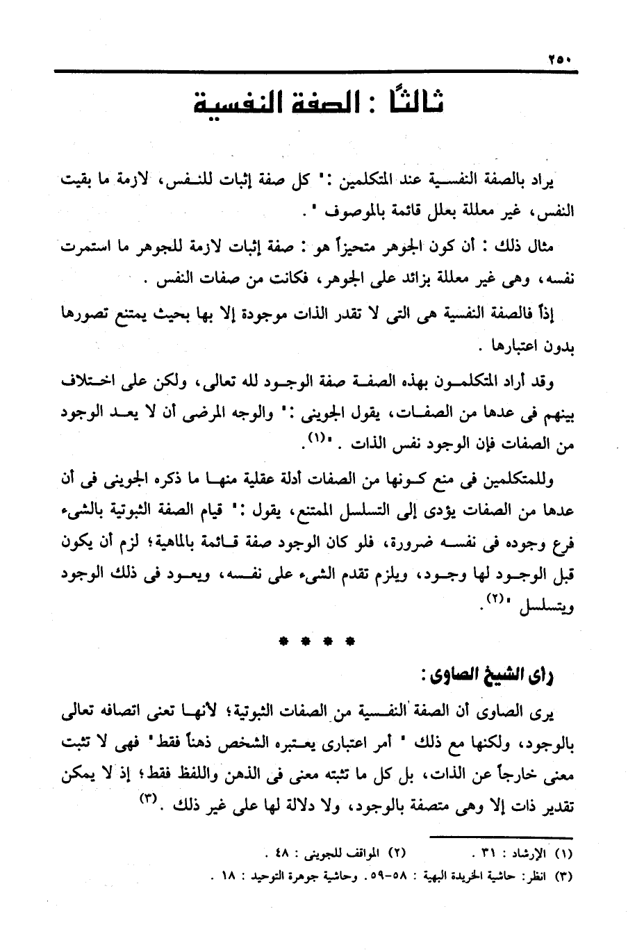 يرى الصاوي أن الصفة النفسية من الصفات الثبوتية؛ لأنها تعنى اتصافه تعالى بالوجود، ولكنها مع ذلك "أمر اعتبارى يعتبره الشخص ذهنًا فقط" فهى لا تثبت معنى خارجًا عن الذات، بل كل ما تثبته معنى في الذهن واللفظ فقط؛ إذ لا يمكن تقدير ذات ألا وهى متصفة بالوجود، ولا دلالة لها على غير ذلك. (٣)