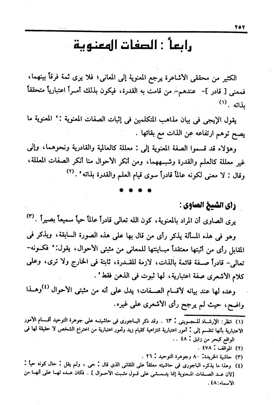 يرى الصاوى أن المراد بالمعنوية، كون الله تعالى قادرًا عالمًا حيًا سميعًا بصيرًا. (٣)