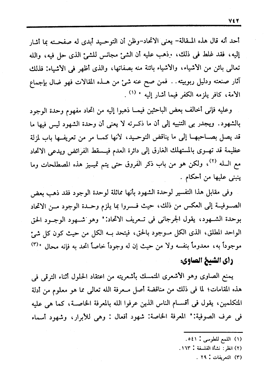 وعليه فإني أخالف بعض الباحثين فيما ذهبوا إليه من اتحاد مفهوم وحدة الوجود بالشهود. ويجدر بي التنبيه إلى أن ما ذكرته لا يعني أن وحدة الشهود ليس فيها ما قد يصل بصاحبها إلى ما يناقض التوحيد، لأنها كما مر من تعريفها باب لمزلة عظيمة قد تهوى بالمستهلك الغارق إلى دائرة العدم فيسقط الفرائض ويدعي الاتحاد مع الله (٢)، ولكن هو من باب ذكر الفروق حتى يتم تمييز هذه المصطلحات وما ينبني عليها من أحكام.