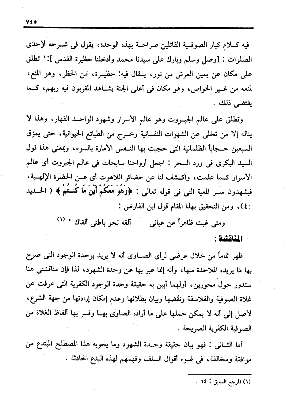 ظهر تمامًا في خلال عرضي لرأى الصاوي أنه لا يريد بوحدة الوجود التي صرح بها ما يريده الملاحدة منها، وأنه إنما عبر بها عن وحدة الشهود، لذا فإن مناقشتي هنا ستدور حول محورين، أولهما أبين به حقيقة وحدة الوجود الكفرية التي عرفت عن غلاة الصوفية والفلاسفة ونقضها وبيان بطلانها وعدم إمكان إرادتها من جهة الشرع، لأصل إلى أنه لا يمكن حملها على ما أراده الصاوي بها وفسر بها ألفاظ الغلاة من الصوفية الكفرية الصريحة.