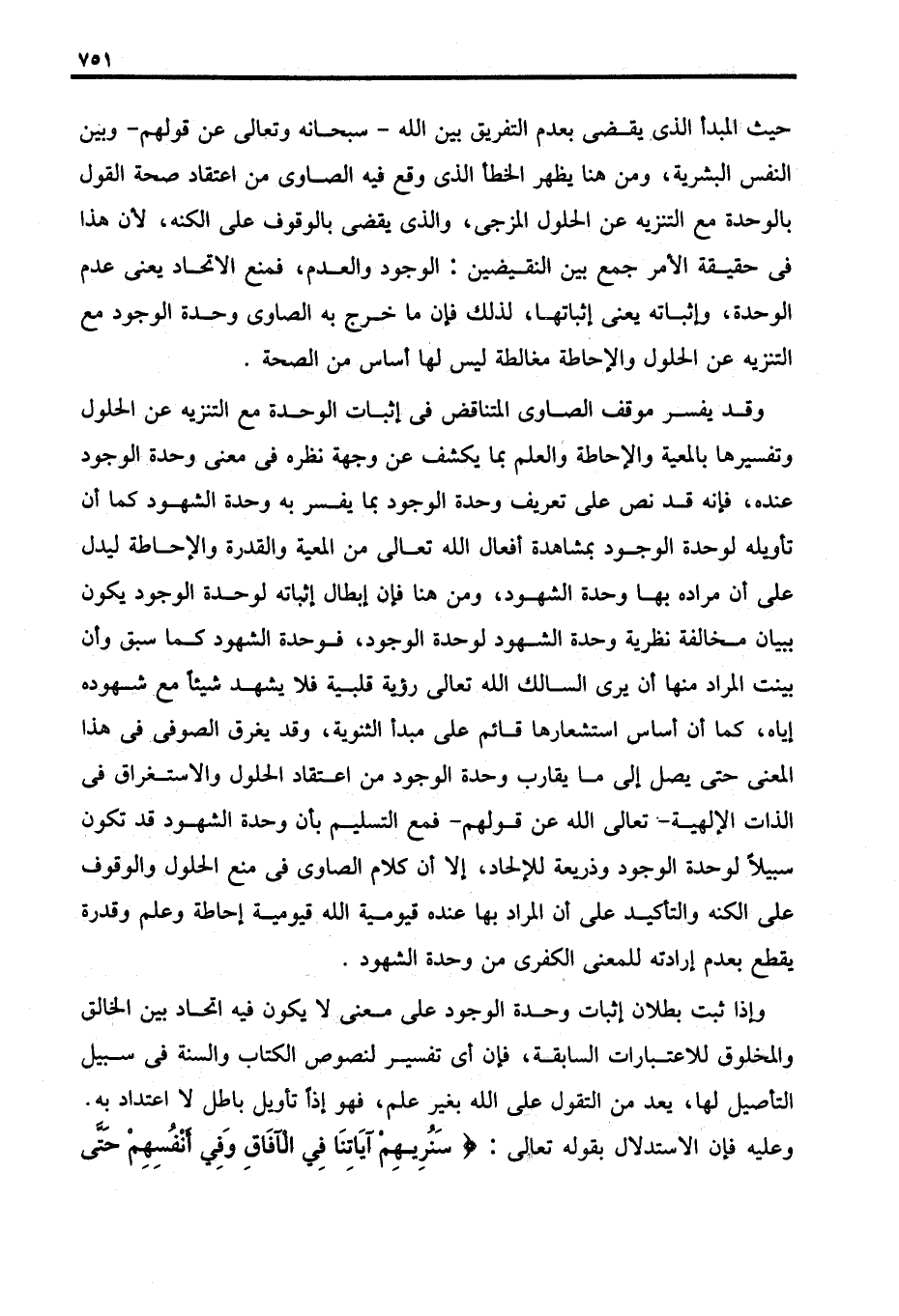 وإذا ثبت بطلان إثبات وحدة الوجود على معنى لا يكون فيه اتحاد بين الخالق والمخلوق للاعتبارات السابقة، فإن أي تفسير لنصوص الكتاب والسنة في سبيل التأصيل لها، يعد من التقول على الله بغير علم، فهو إذًا تأويل باطل لا اعتداد به. وعليه فإن الاستدلال بقوله تعالى: {سَنُرِيهِمْ آيَاتِنَا فِي الْآفَاقِ وَفِي أَنْفُسِهِمْ حَتَّى
