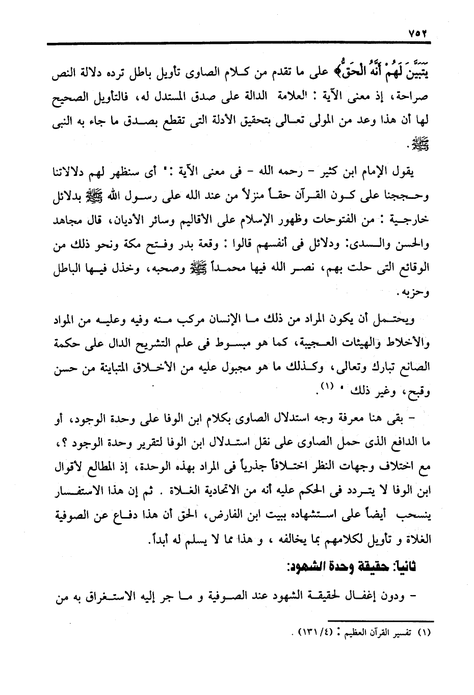 - بقى هنا معرفة وجه استدلال الصاوي بكلام ابن الوفا على وحدة الوجود، أو ما الدافع الذي حمل الصاوي على نقل استدلال ابن الوفا لتقرير وحدة الوجود؟ ، مع اختلاف وجهات النظر اختلافًا جذريًا في المراد بهذه الوحدة، إذ المطالع لأقوال ابن الوفا لا يتردد في الحكم عليه أنه من الاتحادية الغلاة. ثم إن هذا الاستفسار ينسحب أيضًا على استشهاده ببيت ابن الفارض، الحق أن هذا دفاع عن الصوفية الغلاة وتأويل لكلامهم بما يخالفه، وهذا مما لا يسلم له أبدًا.