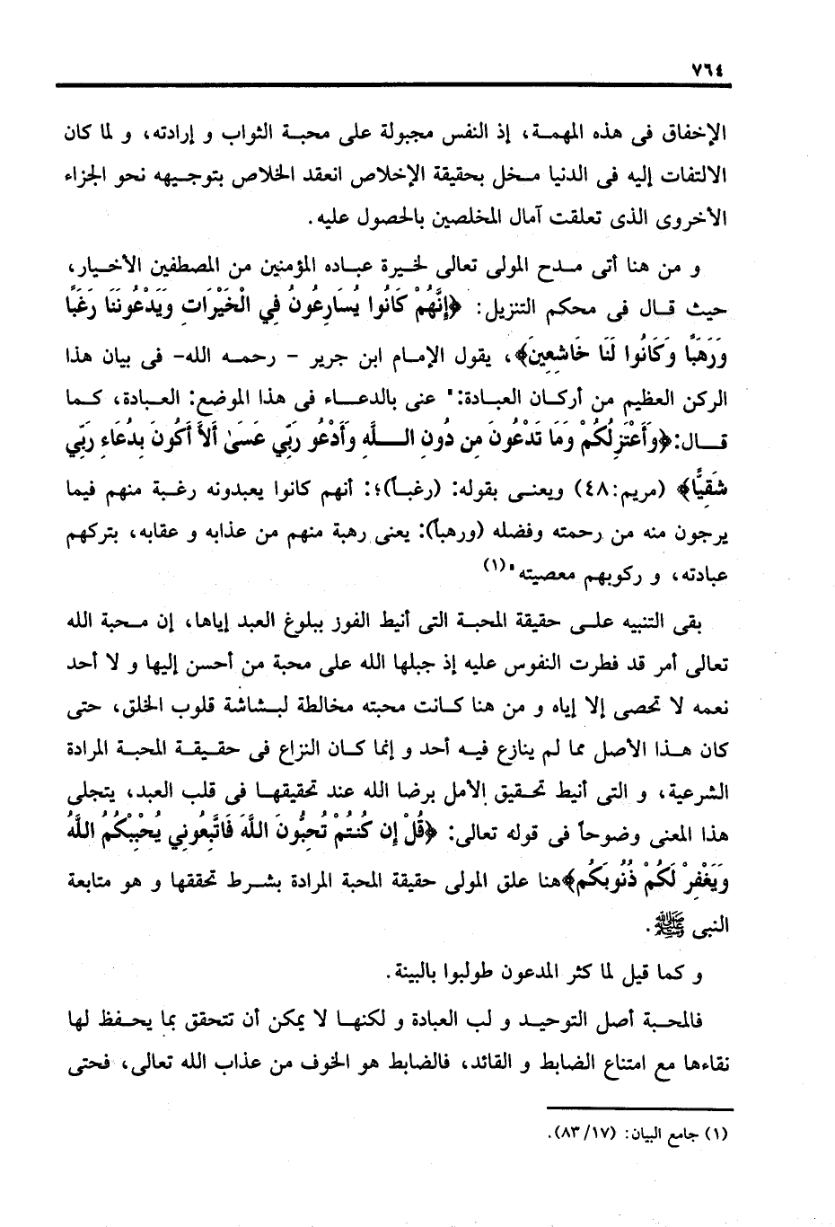 ومن هنا أتى مدح المولى تعالى لخيرة عباده المؤمنين من المصطفين الأخيار، حيث قال في محكم التنزيل: {إِنَّهُمْ كَانُوا يُسَارِعُونَ فِي الْخَيْرَاتِ وَيَدْعُونَنَا رَغَبًا وَرَهَبًا وَكَانُوا لَنَا خَاشِعِينَ}، يقول الإمام ابن جرير - رحمه الله - في بيان هذا الركن العظيم من أركان العبادة: "عنى بالدعاء في هذا الموضع: العبادة، كما قال: {وَأَعْتَزِلُكُمْ وَمَا تَدْعُونَ مِنْ دُونِ اللَّهِ وَأَدْعُو رَبِّي عَسَى أَلَّا أَكُونَ بِدُعَاءِ رَبِّي شَقِيًّا} [مريم: ٤٨] ويعنى بقوله: (رغبًا)؛ : أنهم كانوا يعبدونه رغبة منهم فيما يرجون منه من رحمته وفضله (ورهبًا): يعني رهبة منهم من عذابه وعقابه، بتركهم عبادته، وركوبهم معصيته" (١)