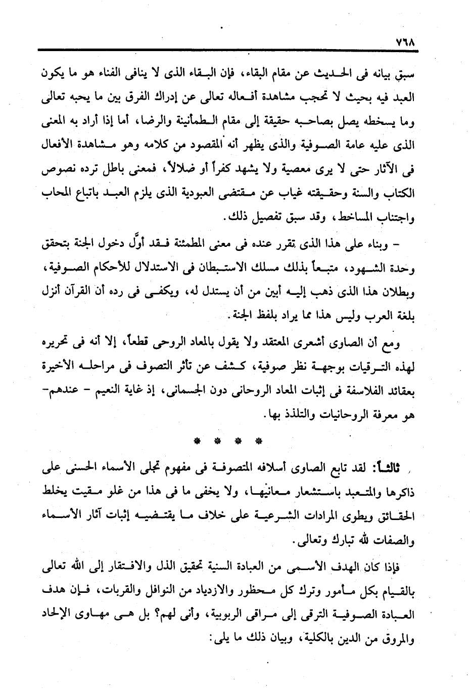 سبق بيانه في الحديث عن مقام البقاء، فبن البقاء الذي لا ينافى الفناء هو ما يكون العبد فيه بحيث لا تحجب مشاهدة أفعاله تعالى عن إدراك الفرق بين ما يحبه تعالى وما يسخطه يصل بصاحبه حقيقة إلى مقام الطمأنينة والرضا، أما إذا أراد به المعنى الذي عليه عامة الصوفية والذي يظهر أنه المقصود من كلامه وهو مشاهدة الأفعال في الآثار حتى لا يرى معصية ولا يشهد كفرًا أو ضلالًا، فمعنى باطل ترده نصوص الكتاب والسنة وحقيقته غياب عن مقتضى العبودية الذي يلزم العبد باتباع المحاب واجتناب المساخط، وقد سبق تفصيل ذلك.