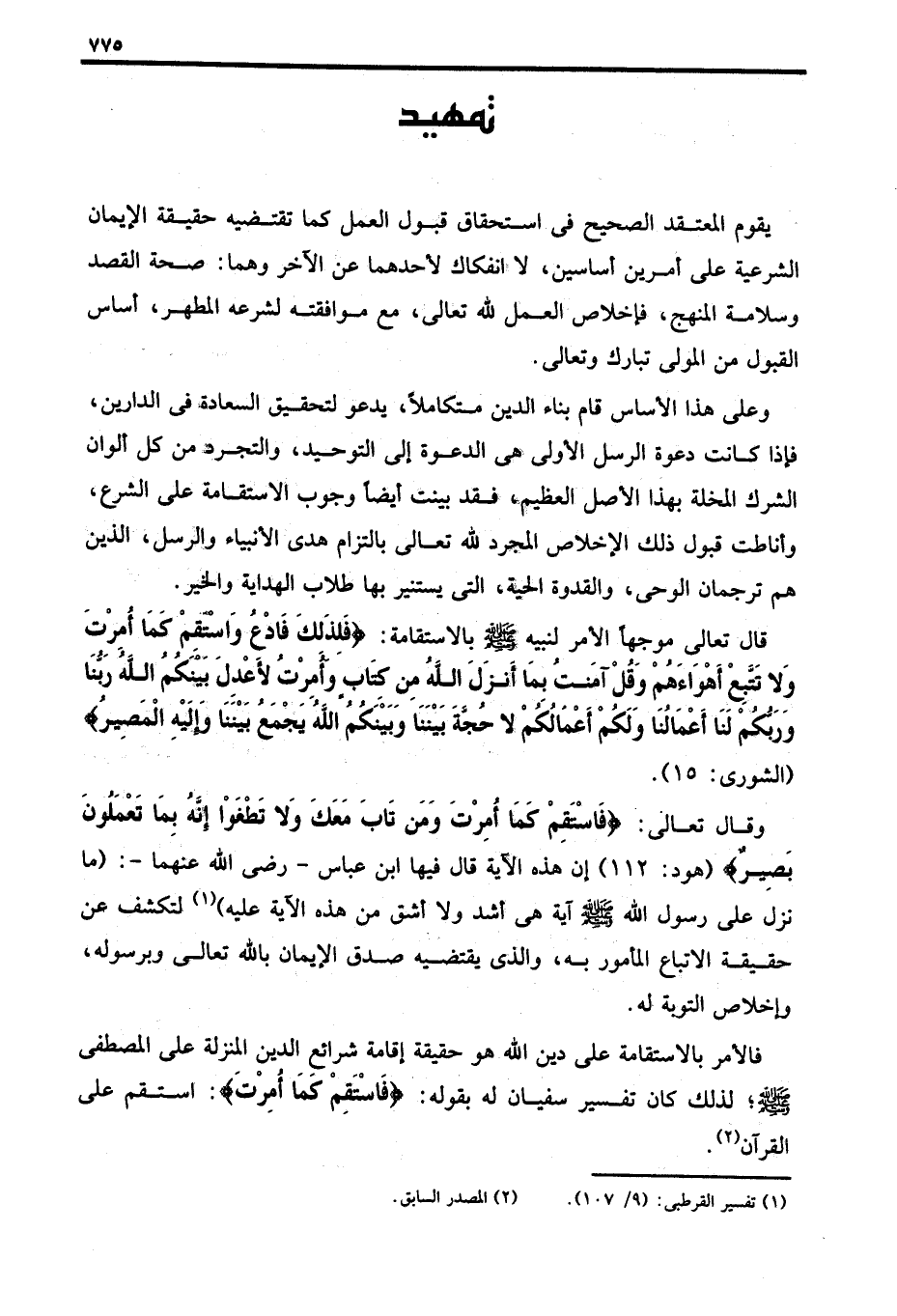 فالأمر بالاستقامة على دين الله هو حقيقة إقامة شرائع الدين المنزلة على المصطفى - صلى الله عليه وسلم -؛ لذلك كان تفسير سفيان له بقوله: {فَاسْتَقِمْ كَمَا أُمِرْتَ}: استقم على القرآن (٢).