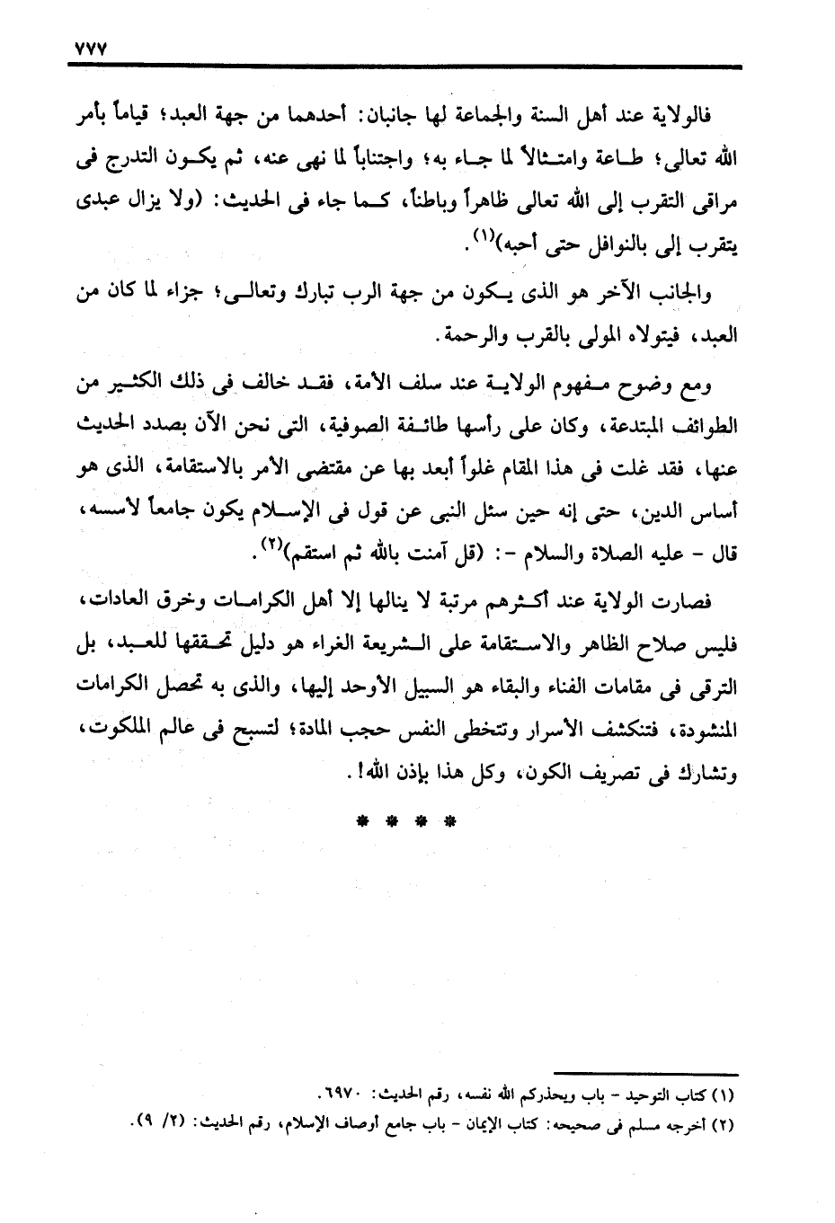 فصارت الولاية عند أكثرهم مرتبة لا ينالها إلا أهل الكرامات وخرق العادات، فليس صلاح الظاهر والاستقامة على الشريعة الغراء هو دليل تحققها للعبد، بل الترقى في مقامات الفناء والبقاء هو السبيل الأوحد إليها، والذي به تحصل الكرامات المنشودة، فتنكشف الأسرار وتتخطى النفس حجب المادة؛ لتسبح في عالم الملكوت، وتشارك في تصريف الكون، وكل هذا بإذن الله! .