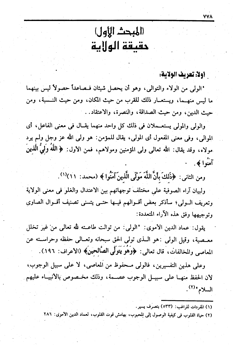 يقول: عماد الدين الأموى: "الولى: من توالت طاعته لله تعالى من غير تخلل معصية، وقيل الولى: هوالذى تولى الحق سبحانه وتعالى حفظه وحراسته عن المعاصى والمخالفات، قال تعالى: {وَهُوَ يَتَوَلَّى الصَّالِحِينَ} [الأعراف: ١٩٦].