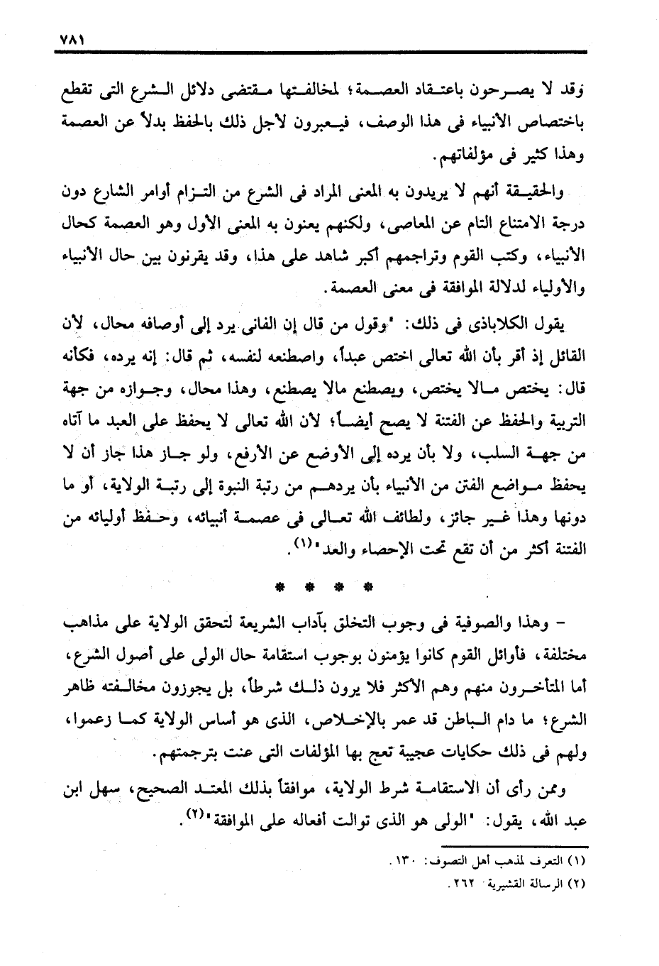 والحقيقة أنهم لا يريدون به المعنى المراد في الشرع من التزام أوامر الشارع دون درجة الامتناع التام عن المعاصى، ولكنهم يعنون به المعنى الأول وهو العصمة كحال الأنبياء، وكتب القوم وتراجمهم أكبر شاهد على هذا، وقد يقرنون بين حال الأنبياء والأولياء لدلالة الموافقة في معنى العصمة.