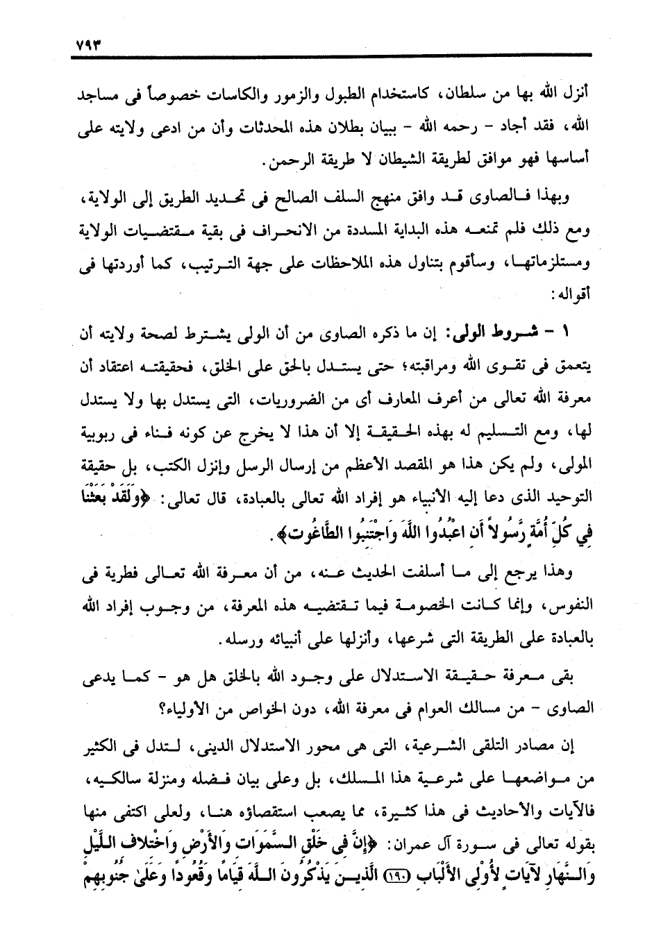 ١ - شروط الولي: إن ما ذكره الصاوي من أن الولى يشترط لصحة ولايته أن يتعمق في تقوى الله ومراقبته؛ حتى يستدل بالحق على الخلق، فحقيقته اعتقاد أن معرفة الله تعالى من أعرف المعارف أي من الضروريات، التي يستدل بها ولا يستدل لها، ومع التسليم له بهذه الحقيقة إلا أن هذا لا يخرج عن كونه فناء في ربوبية المولى، ولم يكن هذا هو المقصد الأعظم من إرسال الرسل وإنزال الكتب، بل حقيقة التوحيد الذي دعا إليه الأنبياء هو إفراد الله تعالى بالعبادة، قال تعالى: {وَلَقَدْ بَعَثْنَا فِي كُلِّ أُمَّةٍ رَسُولًا أَنِ اعْبُدُوا اللَّهَ وَاجْتَنِبُوا الطَّاغُوتَ}.
