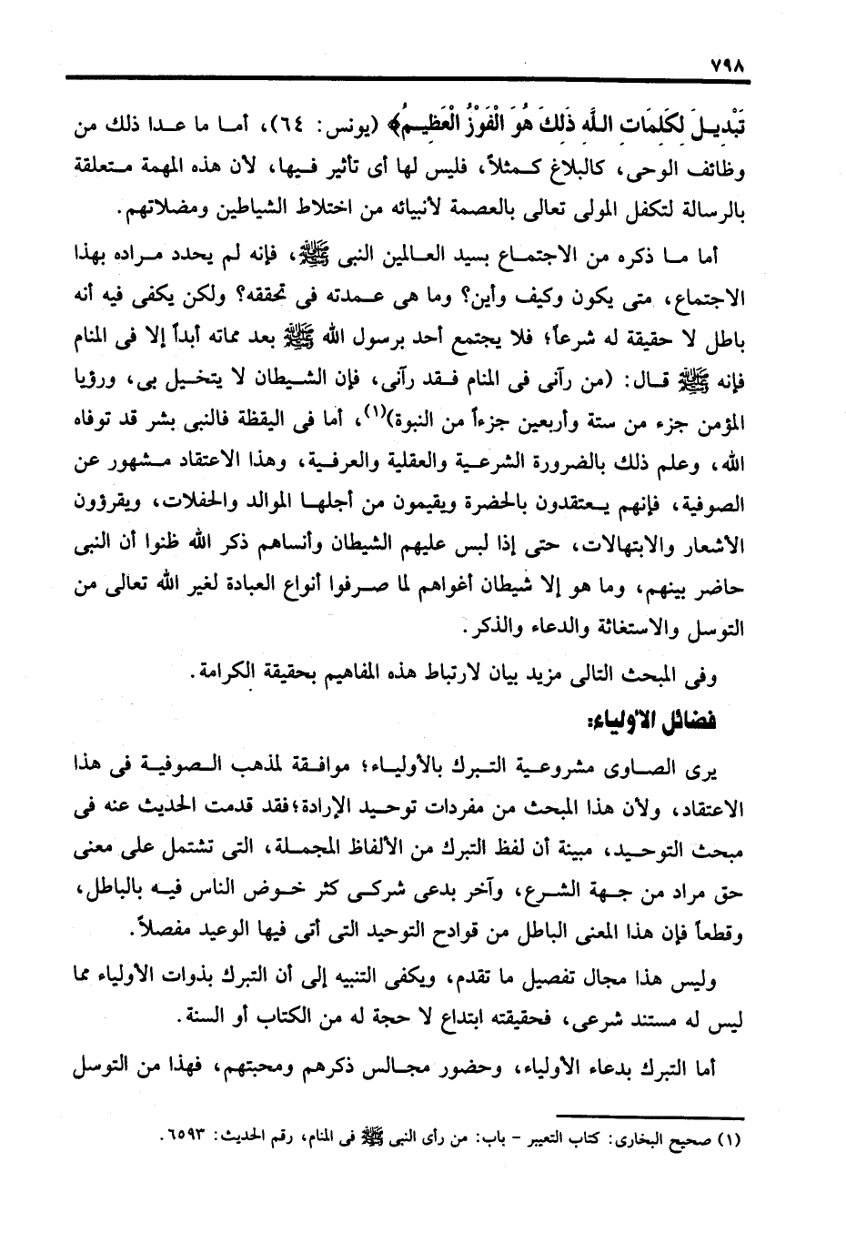 أما ما ذكره من الاجتماع بسيد العالمين النبي - صلى الله عليه وسلم -، فإنه لم يحدد مراده بهذا الاجتماع، متى يكون وكيف وأين؟ وما هي عمدته في تحققه؟ ولكن يكفي فيه أنه باطل لا حقيقة له شرعًا؛ فلا يجتمع أحد برسول الله - صلى الله عليه وسلم - بعد مماته أبدًا إلا في المنام فإنه - صلى الله عليه وسلم - قال: (من رآني في المنام فقد رآني، فإن الشيطان لا يتخيل بي، ورؤيا المؤمن جزء من ستة وأربعين جزءًا من النبوة) (١)، أما في اليقظة فالنبي بشر قد توفاه الله، وعلم ذلك بالضرورة الشرعية والعقلية والعرفية، وهذا الاعتقاد مشهور عن الصوفية، فإنهم يعتقدون بالحضرة ويقيمون من أجلها الموالد والحفلات، ويقرؤون الأشعار والابتهالات، حتى إذا لبس عليهم الشيطان وأنساهم ذكر الله ظنوا أن النبي حاضر بينهم، وما هو إلا شيطان أغواهم لما صرفوا أنواع العبادة لغير الله تعالى من التوسل والاستغاثة والدعاء والذكر.