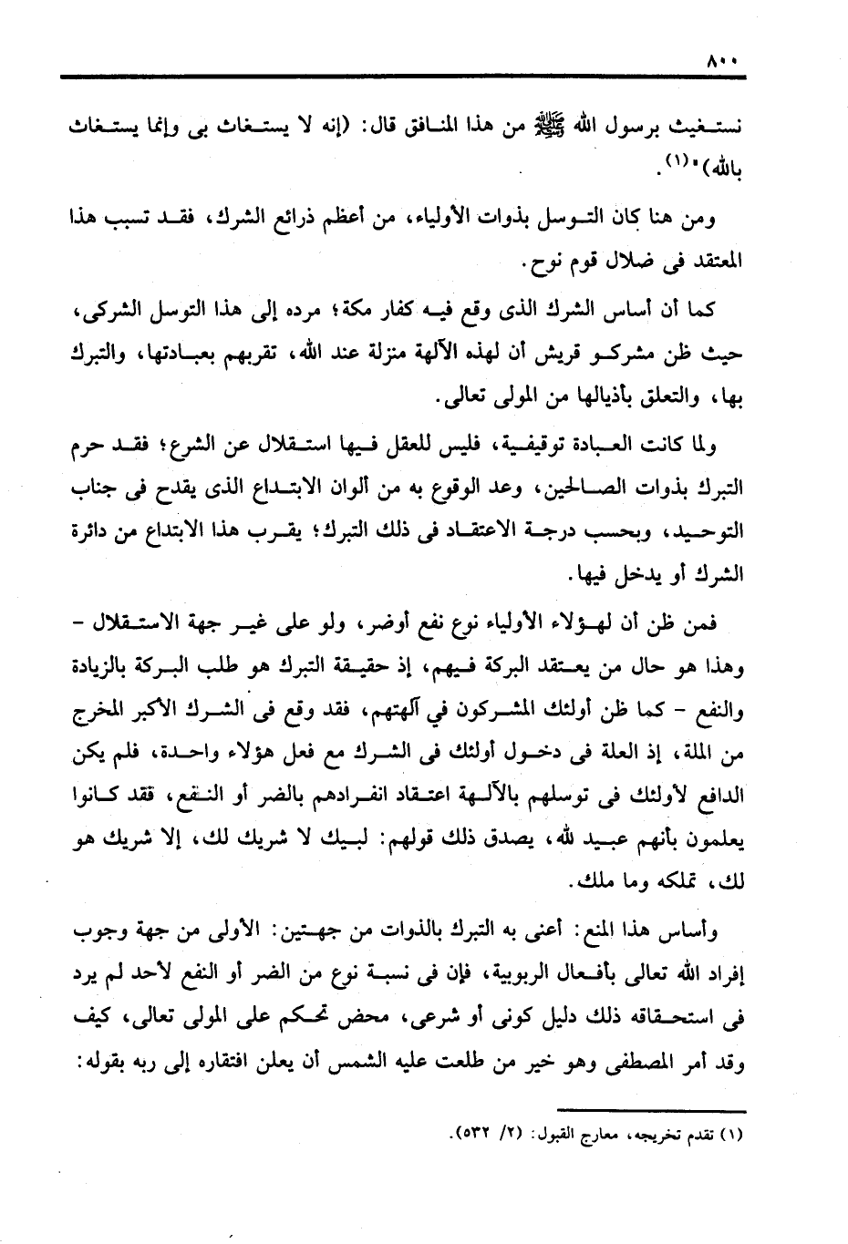 فمن ظن أن لهؤلاء الأولياء نوع نفع أو ضر، ولو على غير جهة الاستقلال - وهذا هو حال من يعتقد البركة فيهم، إذ حقيقة التبرك هو طلب البركة بالزيادة والنفع - كما ظن أولئك المشركون في آلهتهم، فقد وقع في الشرك الأكبر المخرج من الملة، إذ العلة في دخول أولئك في الشرك مع فعل هؤلاء واحدة، فلم يكن الدافع لأولئك في توسلهم بالآلهة اعتقاد انفرادهم بالضر أو النفع، فقد كانوا يعلمون بأنهم عبيد الله، يصدق ذلك قولهم: لبيك لا شريك لك، إلا شريك هو لك، تملكه وما ملك.