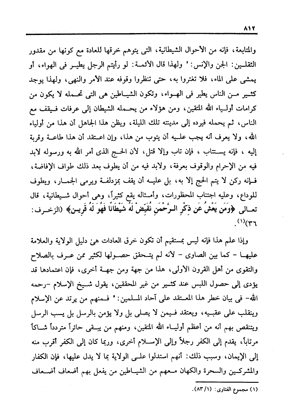والمتابعة، فإنه من الأحوال الشيطانية، التي يتوهم خرقها للعادة مع كونها من مقدور الثقلين: الجن والإنس: "ولهذا قال الأئمة: لو رأيتم الرجل يطير في الهواء، أو يمشى على الماء، فلا تغتروا به، حتى تنظروا وقوفه عند الأمر والنهى، ولهذا يوجد كثير من الناس يطير في الهواء، وتكون الشياطين هي التي تحمله لا يكون من كرامات أولياء الله المتقين، ومن هؤلاء من يحمله الشيطان إلى عرفات فيقف مع الناس، ثم يحمله فيرده إلى مدينته تلك الليلة، ويظن هذا الجاهل أن هذا من أولياء الله، ولا يعرف أنه يجب عليه أن يتوب من هذا، وإن اعتقد أن هذا طاعة وقربة إليه، فإنه يستتاب، فإن تاب وإلا قتل، لأن الحج الذي أمر الله به ورسوله لا بد فيه من الإحرام والوقوف بعرفة، ولا بد فيه من أن يطوف بعد ذلك طواف الإفاضة، فإنه ركن لا يتم الحج إلا به، بل عليه أن يقف بمزدلفة ويرمى الجمار، ويطوف للوداع، وعليه اجتناب المحظورات، وأمثاله يقع كثيرًا، وهى أحوال شيطانية، قال تعالى {وَمَنْ يَعْشُ عَنْ ذِكْرِ الرَّحْمَنِ نُقَيِّضْ لَهُ شَيْطَانًا فَهُوَ لَهُ قَرِينٌ} [الزخرف: ٣٦] (١).
