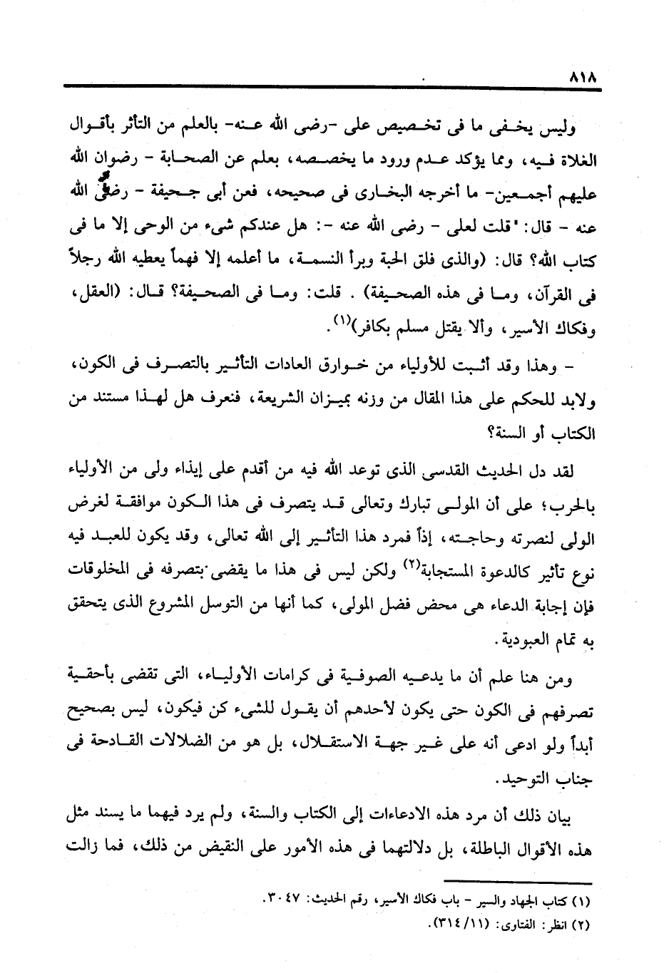 ومن هنا علم أن ما يدعيه الصوفية في كرامات الأولياء، التي تقضي بأحقية تصرفهم في الكون حتى يكون لأحدهم أن يقول للشيء كن فيكون، ليس بصحيح أبدًا ولو ادعى أنه على غير جهة الاستقلال، بل هو من الضلالات القادحة في جناب التوحيد.