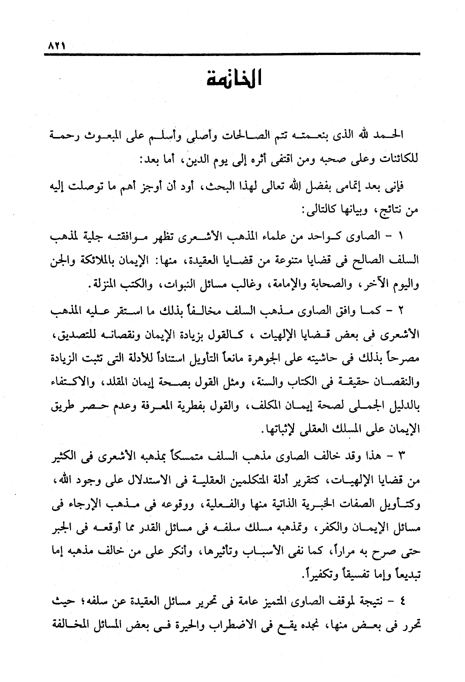 ٤ - نتيجة لموقف الصاوي المتميز عامة في تحرير مسائل العقيدة عن سلفه؛ حيث تحرر في بعض منها، نجده يقع في الاضطراب والحيرة في بعض المسائل المخالفة