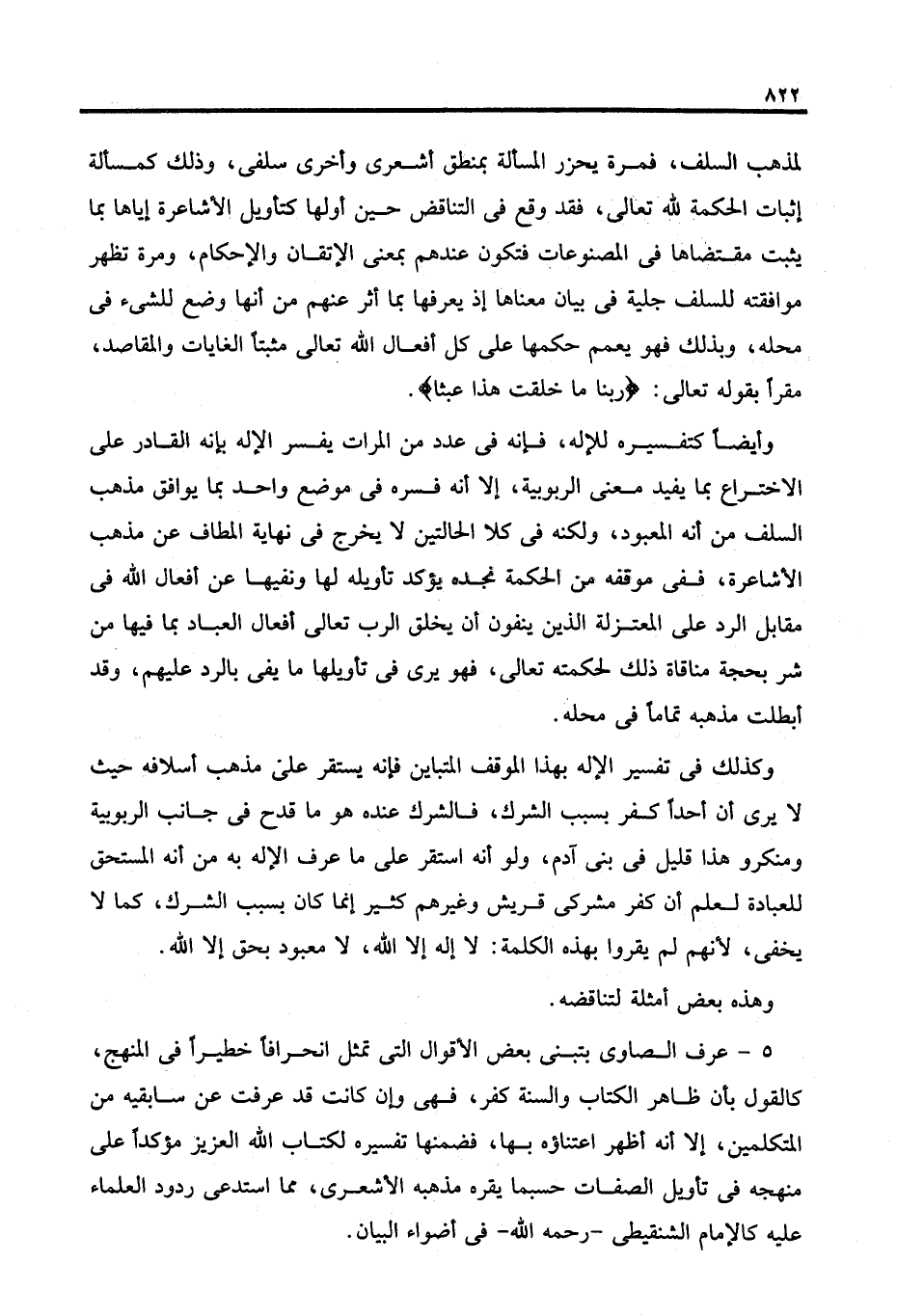 لمذهب السلف، فمرة يحزر المسألة بمنطق أشعرى وأخرى سلفى، وذلك كمسألة إثبات الحكمة لله تعالى، فقد وقع في التناقض حين أولها كتأويل الأشاعرة إياها بما يثبت مقتضاها في المصنوعات فتكون عندهم بمعنى الإتقان والإحكام، ومرة تظهر موافقته للسلف جلية في بيان معناها إذ يعرفها بما أثر عنهم من أنها وضع للشيء في محله، وبذلك فهو يعمم حكمها على كل أفعال الله تعالى مثبتًا الغايات والمقاصد، مقرًا بقوله تعالى: {رَبَّنَا مَا خَلَقْتَ هَذَا بَاطِلًا}.