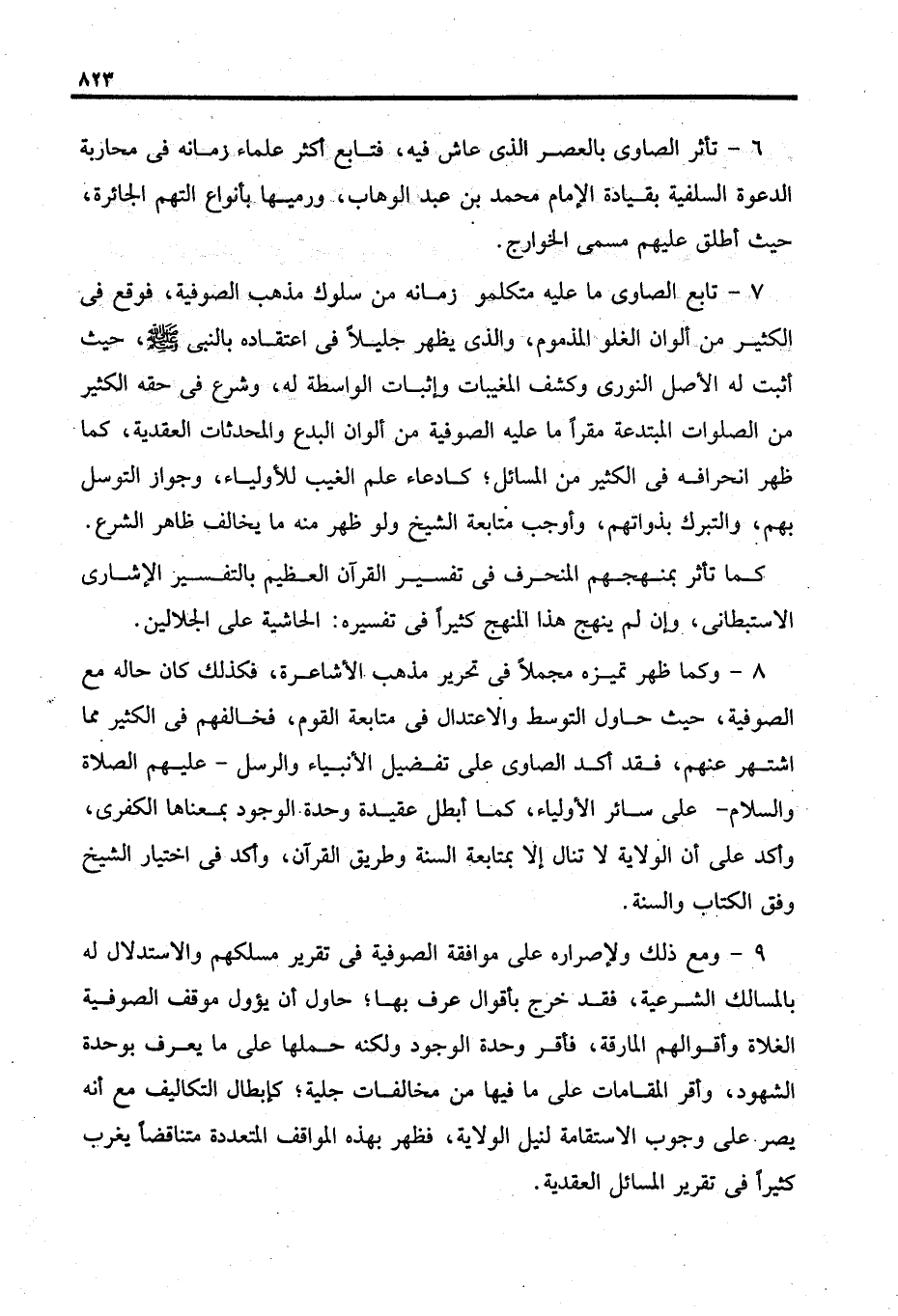 ٦ - تأثر الصاوي بالعصر الذي عاش فيه، فتابع أكثر علماء زمانه في محاربة الدعوة السلفية بقيادة الإمام محمد بن عبد الوهاب، ورميها بأنواع التهم الجائرة، حيث أطلق عليهم مسمى الخوارج.