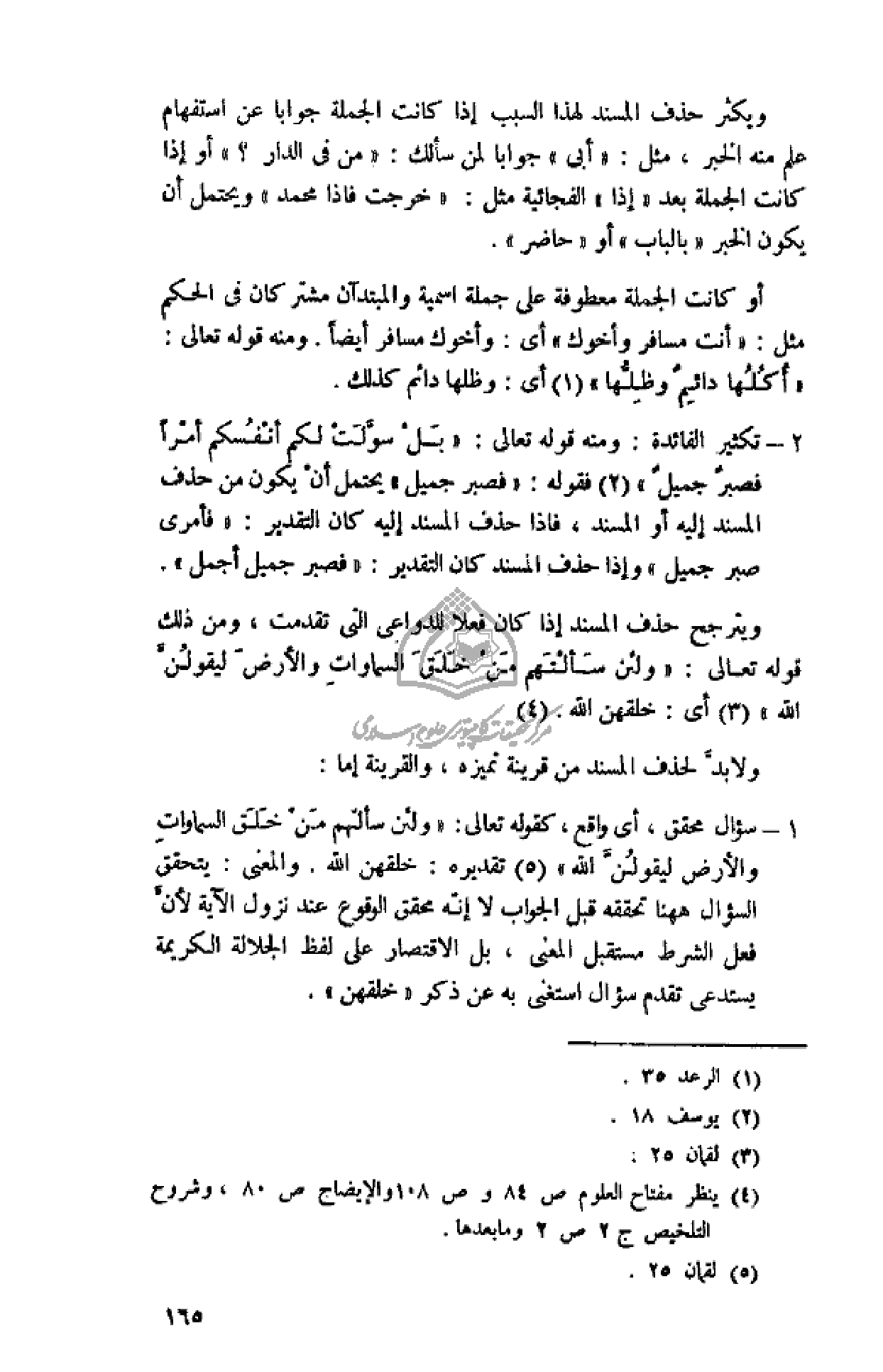 ويترجح حذف المسند إذا كان فعلا للدواعى التى تقدمت، ومن ذلك قوله تعالى: «وَلَئِنْ سَأَلْتَهُمْ مَنْ خَلَقَ السَّماواتِ وَالْأَرْضَ لَيَقُولُنَّ اللَّهُ» (¬3) أى: خلقهن الله. (¬4)