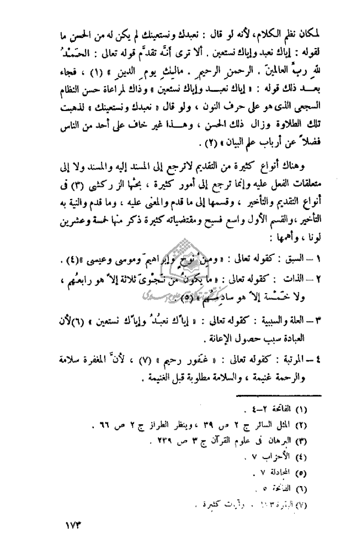 - العلة والسببية: كقوله تعالى: «إِيَّاكَ نَعْبُدُ وَإِيَّاكَ نَسْتَعِينُ» (¬6) لأن العبادة سبب حصول الإعانة.