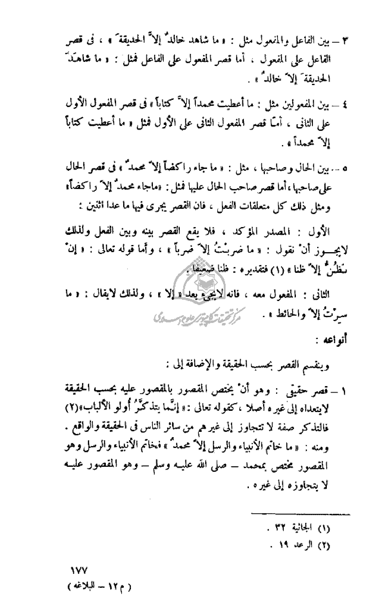 - بين الفاعل والمفعول مثل: «ما شاهد خالد إلّا الحديقة»، فى قصر الفاعل على المفعول، أما قصر المفعول على الفاعل فمثل: «ما شاهد الحديقة إلّا خالد».
