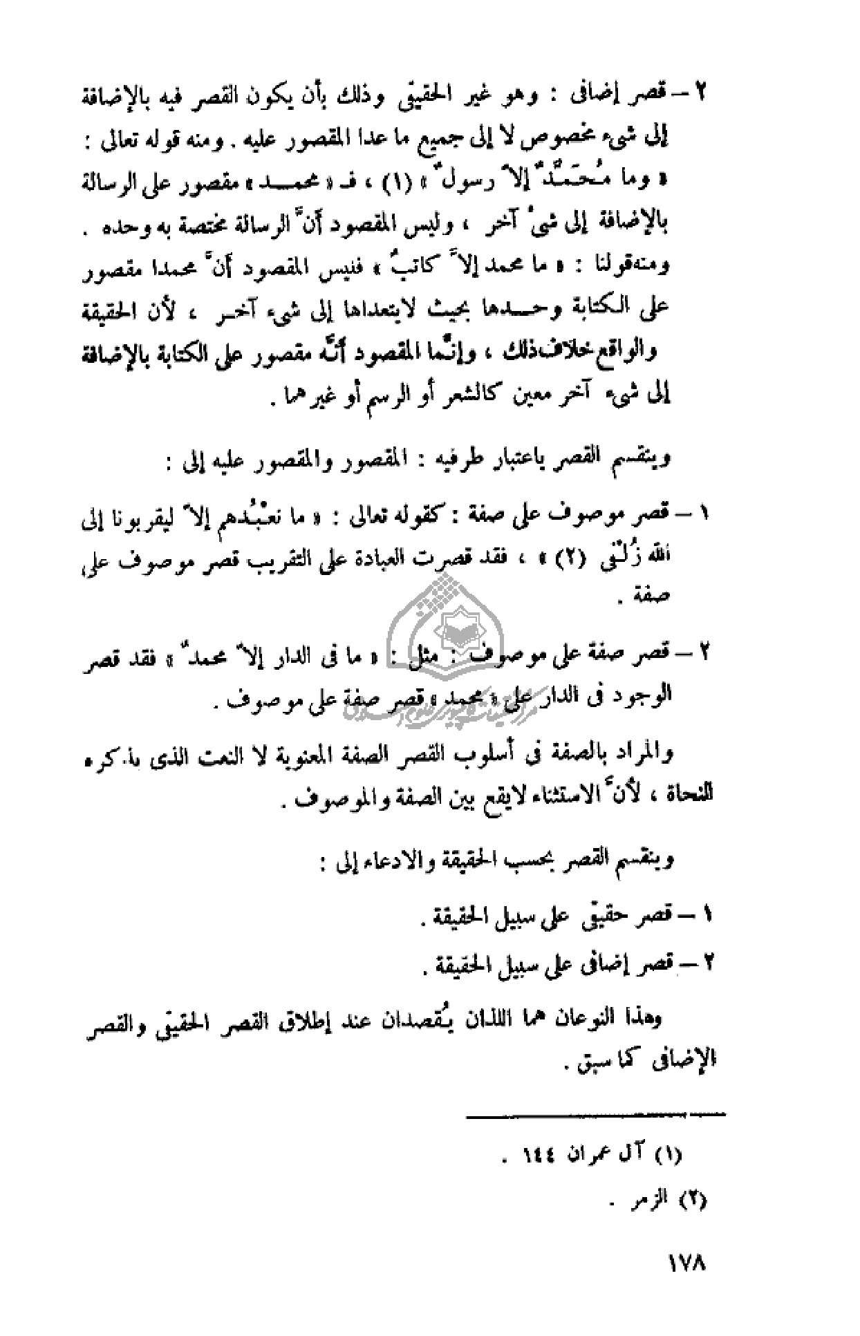 ومنه قولنا: «ما محمد إلّا كاتب» فليس المقصود أنّ محمدا مقصور على الكتابة وحدها بحيث لا يتعداها إلى شئ آخر، لأن الحقيقة والواقع خلاف ذلك، وإنّما المقصود أنّه مقصور على الكتابة بالإضافة إلى شئ آخر معين كالشعر أو الرسم أو غيرهما.