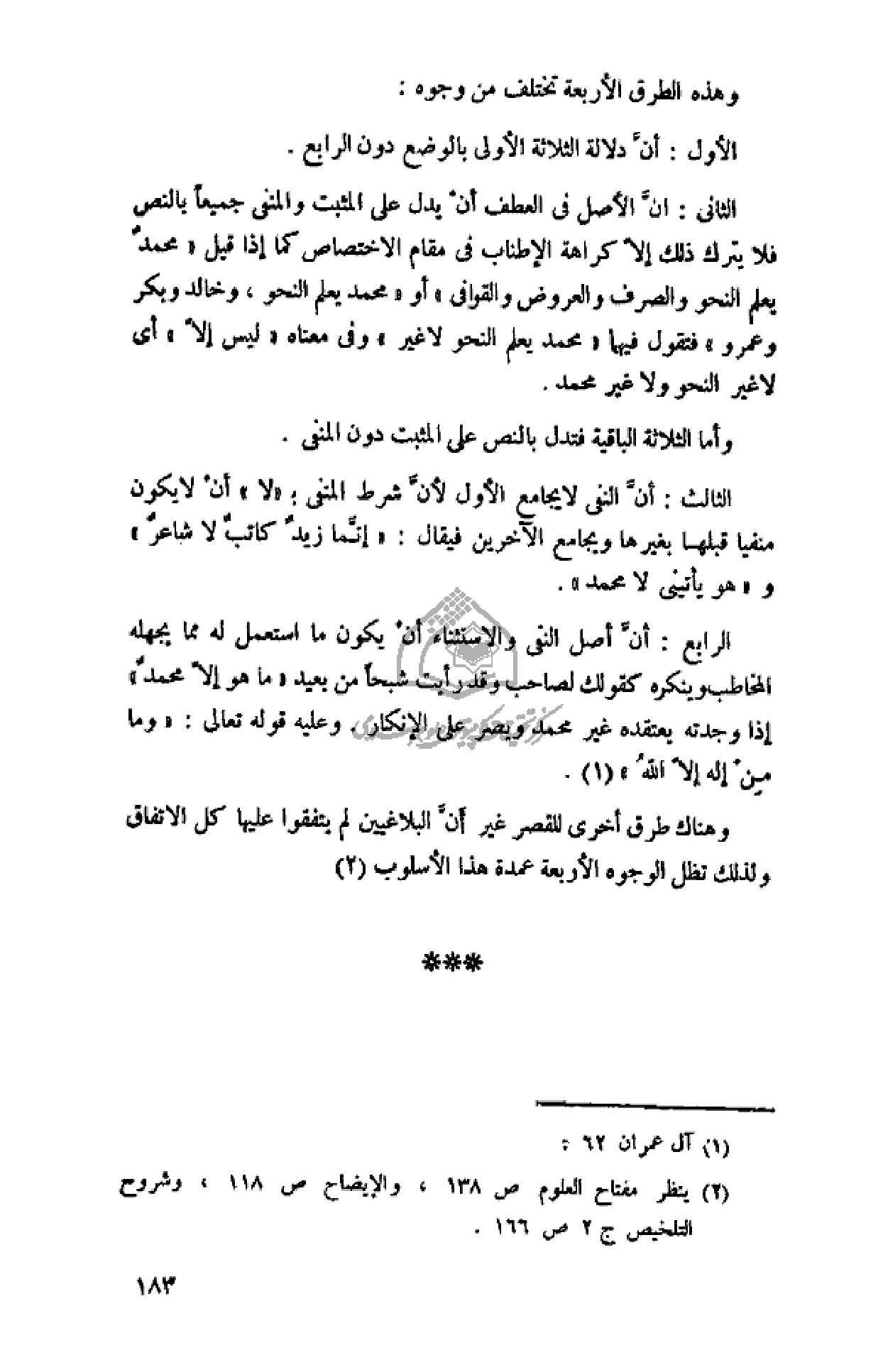 الثانى: انّ الأصل فى العطف أن يدل على المثبت والمنفى جميعا بالنص فلا يترك ذلك إلّا كراهة الإطناب فى مقام الاختصاص كما إذا قيل «محمد يعلم النحو والصرف والعروض والقوافى» أو «محمد يعلم النحو، وخالد وبكر وعمرو» فتقول فيهما «محمد يعلم النحو لا غير» وفى معناه «ليس إلّا» أى لا غير النحو ولا غير محمد.