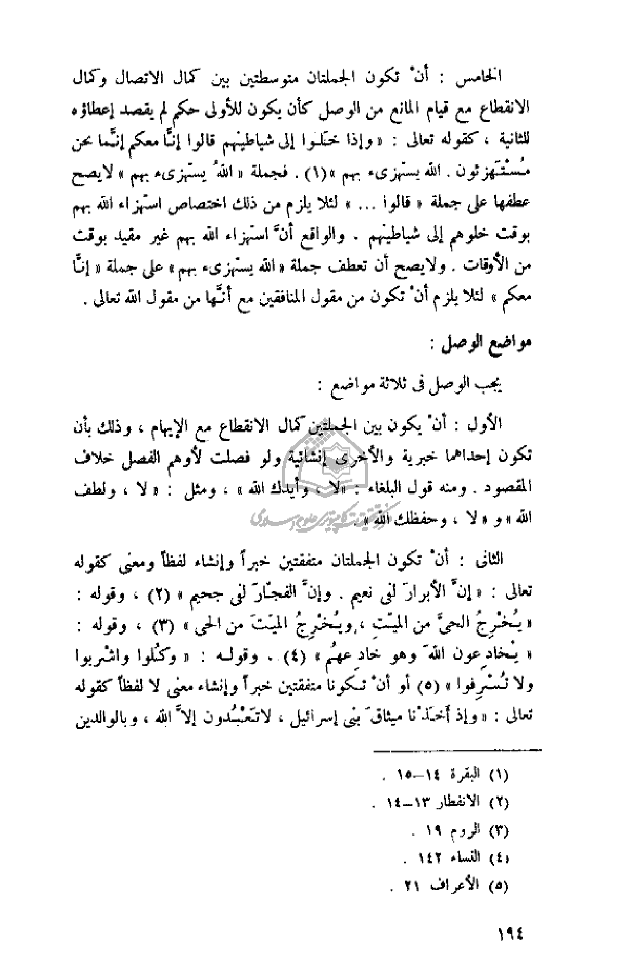 الخامس: أن تكون الجملتان متوسطتين بين كمال الاتصال وكمال الانقطاع مع قيام المانع من الوصل كأن يكون للأولى حكم لم يقصد إعطاؤه للثانية، كقوله تعالى: «وَإِذا خَلَوْا إِلى شَياطِينِهِمْ قالُوا إِنَّا مَعَكُمْ إِنَّما نَحْنُ مُسْتَهْزِؤُنَ. اللَّهُ يَسْتَهْزِئُ بِهِمْ» (¬1). فجملة «اللَّهُ يَسْتَهْزِئُ بِهِمْ» لا يصح عطفها على جملة «قالوا ...» لئلا يلزم من ذلك اختصاص استهزاء الله بهم بوقت خلوهم إلى شياطينهم، والواقع أنّ استهزاء الله بهم غير مقيد بوقت من الأوقات. ولا يصح أن تعطف جملة «الله يستهزئ بهم» على جملة «إنّا معكم» لئلا يلزم أن تكون من مقول المنافقين مع أنّها من مقول الله تعالى.