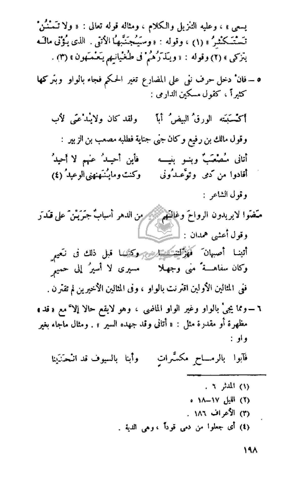 يسعى»، وعليه التنزيل والكلام، ومثاله قوله تعالى: «وَلا تَمْنُنْ تَسْتَكْثِرُ» (¬1)، وقوله: «وَسَيُجَنَّبُهَا الْأَتْقَى. الَّذِي يُؤْتِي مالَهُ يَتَزَكَّى» (¬2) وقوله: «وَيَذَرُهُمْ فِي طُغْيانِهِمْ يَعْمَهُونَ» (¬3).