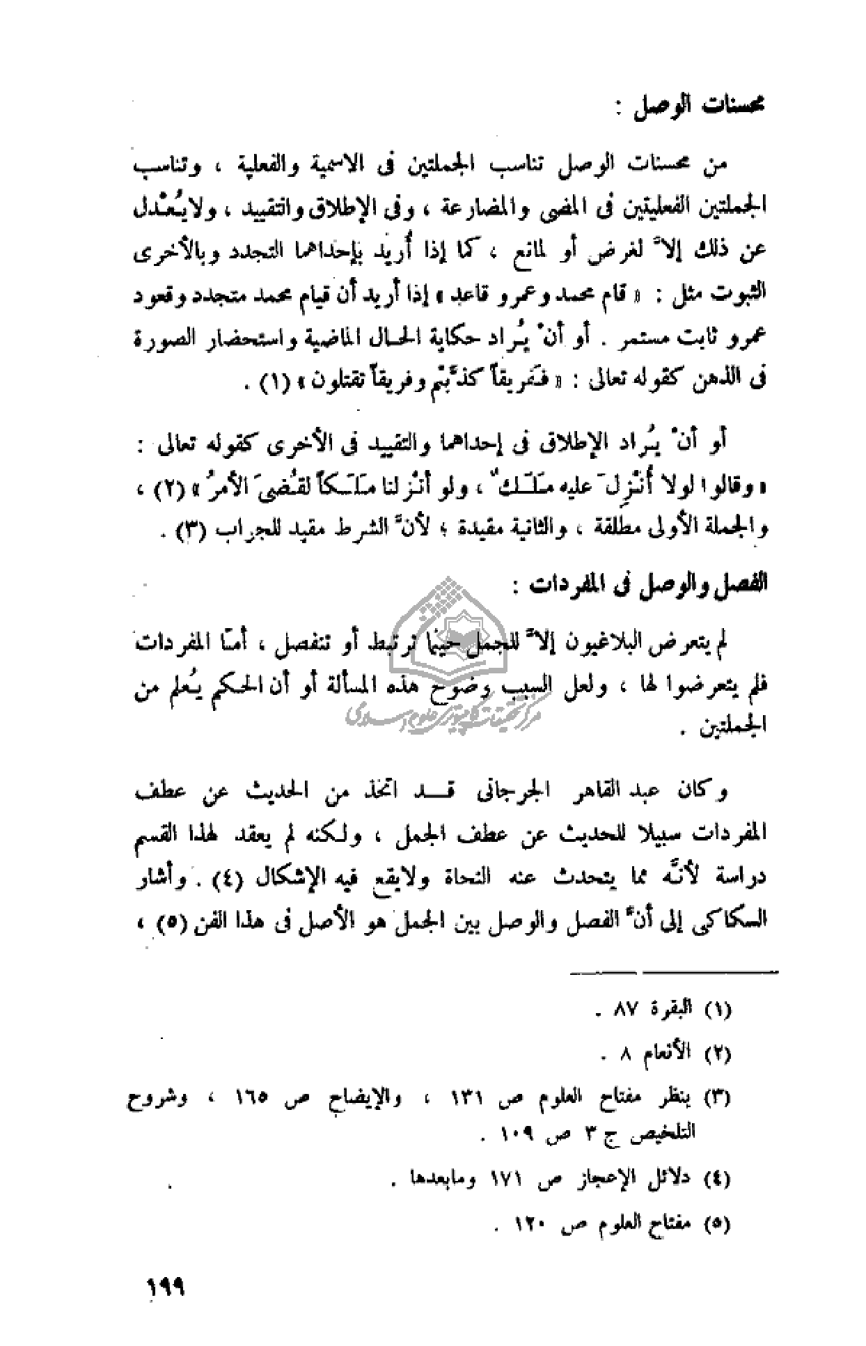 وكان عبد القاهر الجرجانى قد اتخذ من الحديث عن عطف المفردات سبيلا للحديث عن عطف الجمل، ولكنه لم يعقد لهذا القسم دراسة لأنّه مما يتحدث عنه النحاة ولا يقع فيه الإشكال (¬4). وأشار السكاكى إلى أنّ الفصل والوصل بين الجمل هو الأصل فى هذا الفن (¬5)،