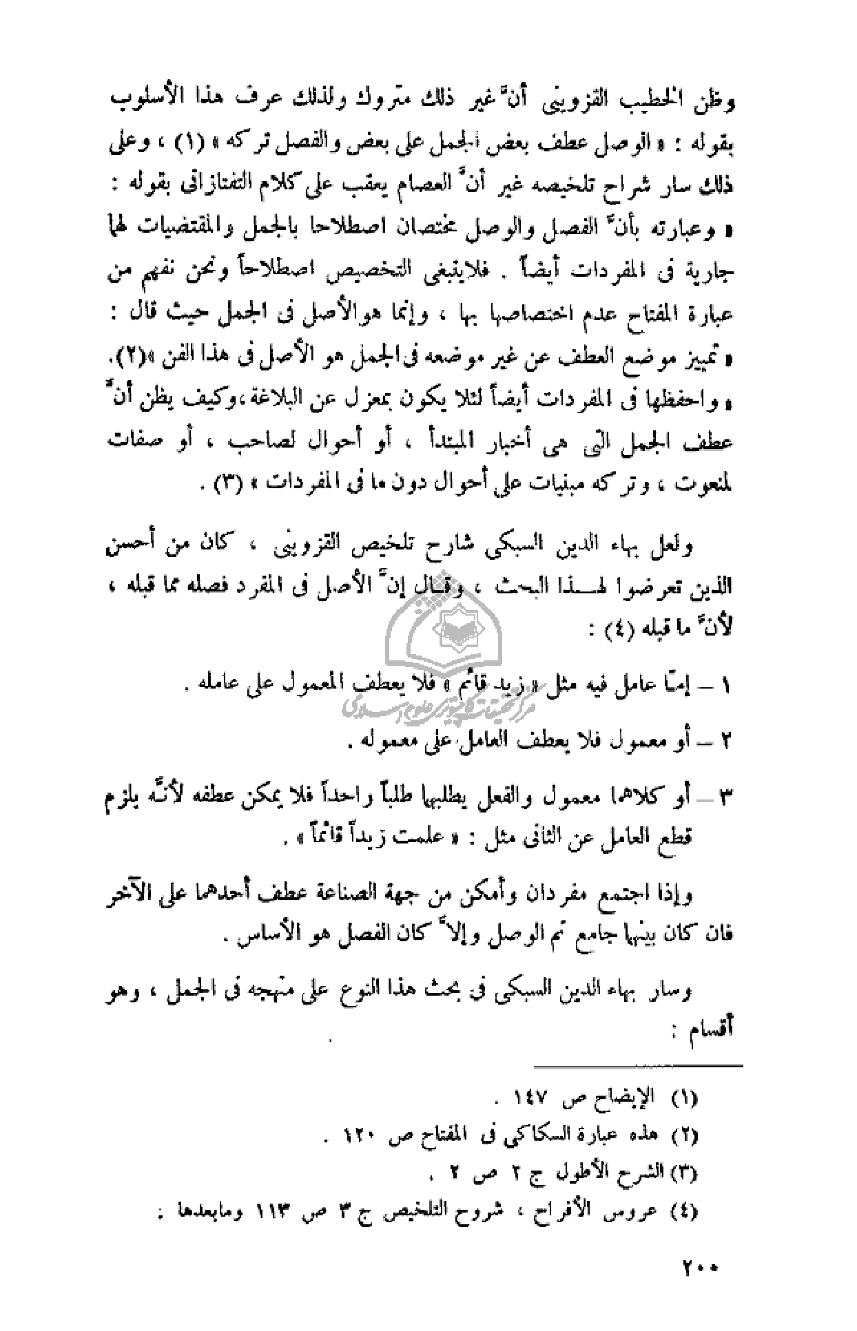 ولعل بهاء الدين السبكى شارح تلخيص القزوينى، كان من أحسن الذين تعرضوا لهذا البحث، وقال إنّ الأصل فى المفرد فصله مما قبله، لأنّ ما قبله (¬4):