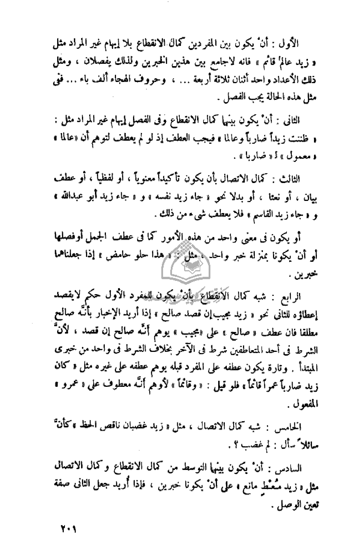 الرابع: شبه كمال الانقطاع بأن يكون للمفرد الأول حكم لا يقصد إعطاؤه للثانى نحو «زيد مجيب إن قصد صالح» إذا أريد الإخبار بأنّه صالح مطلقا فان عطف «صالح» على «مجيب» يوهم أنّه صالح إن قصد، لأنّ الشرط فى أحد المتعاطفين شرط فى الآخر بخلاف الشرط فى واحد من خبرى المبتدأ. وتارة يكون عطفه على المفرد قبله يوهم عطفه على غيره مثل «كان زيد ضاربا عمرا قائما» فلو قيل: «وقائما» لأوهم أنّه معطوف على «عمرو» المفعول.