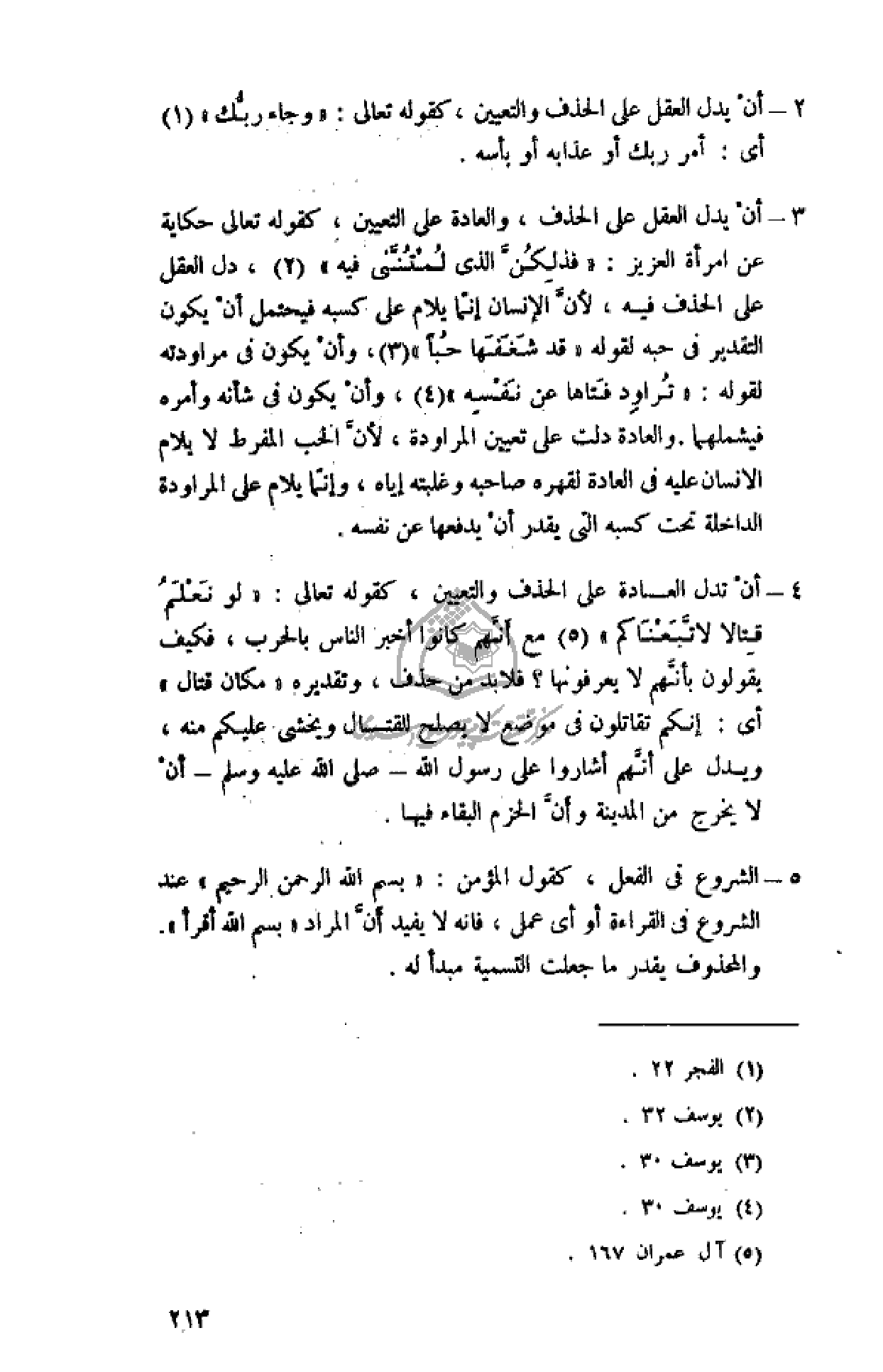 - أن يدل العقل على الحذف، والعادة على التعيين، كقوله تعالى حكاية عن امرأة العزيز: «فَذلِكُنَّ الَّذِي لُمْتُنَّنِي فِيهِ» (¬2)، دل العقل على الحذف فيه، لأنّ الإنسان إنّما يلام على كسبه فيحتمل أن يكون التقدير فى حبه لقوله «قَدْ شَغَفَها حُبًّا» (¬3)، وأن يكون فى مراودته لقوله: «تُراوِدُ فَتاها عَنْ نَفْسِهِ» (¬4)، وأن يكون فى شأنه وأمره فيشملهما. والعادة دلت على تعيين المراودة، لأنّ الحب المفرط لا يلام الانسان عليه فى العادة لقهره صاحبه وغلبته إياه، وإنّما يلام على المراودة الداخلة تحت كسبه التى يقدر أن يدفعها عن نفسه.