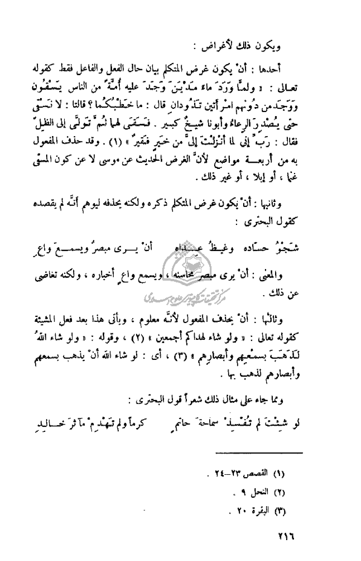 أحدها: أن يكون غرض المتكلم بيان حال الفعل والفاعل فقط كقوله تعالى: «وَلَمَّا وَرَدَ ماءَ مَدْيَنَ وَجَدَ عَلَيْهِ أُمَّةً مِنَ النَّاسِ يَسْقُونَ وَوَجَدَ مِنْ دُونِهِمُ امْرَأَتَيْنِ تَذُودانِ قالَ: ما خَطْبُكُما؟ قالَتا: لا نَسْقِي حَتَّى يُصْدِرَ الرِّعاءُ وَأَبُونا شَيْخٌ كَبِيرٌ. فَسَقى لَهُما ثُمَّ تَوَلَّى إِلَى الظِّلِّ فَقالَ: رَبِّ إِنِّي لِما أَنْزَلْتَ إِلَيَّ مِنْ خَيْرٍ فَقِيرٌ» (¬1). وقد حذف المفعول به من أربعة مواضع لأنّ الغرض الحديث عن موسى لا عن كون المسقى غنما، أو إبلا، أو غير ذلك.
