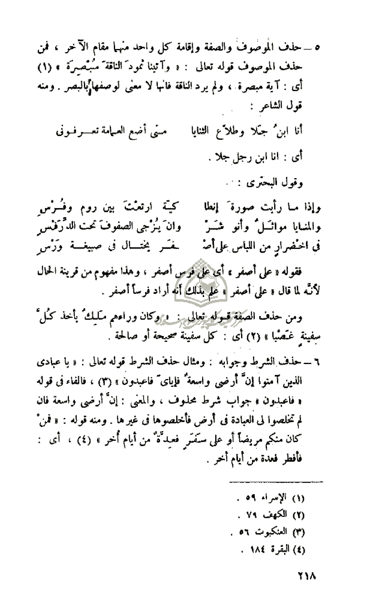ومن حذف الصفة قوله تعالى: «وَكانَ وَراءَهُمْ مَلِكٌ يَأْخُذُ كُلَّ سَفِينَةٍ غَصْباً» (¬2) أى: كل سفينة صحيحة أو صالحة.