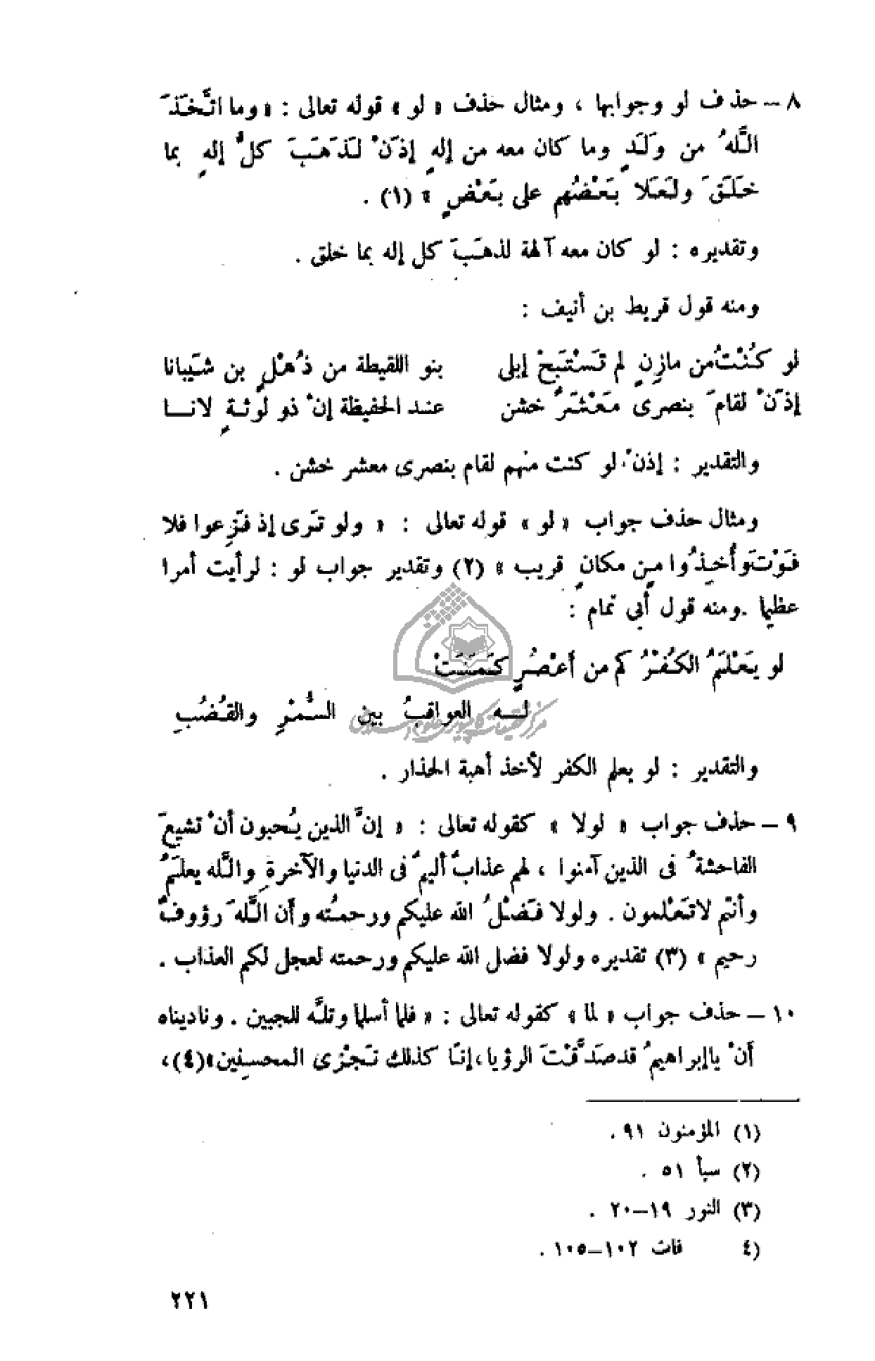 - حذف جواب «لولا» كقوله تعالى: «إِنَّ الَّذِينَ يُحِبُّونَ أَنْ تَشِيعَ الْفاحِشَةُ فِي الَّذِينَ آمَنُوا، لَهُمْ عَذابٌ أَلِيمٌ فِي الدُّنْيا وَالْآخِرَةِ وَاللَّهُ يَعْلَمُ وَأَنْتُمْ لا تَعْلَمُونَ. وَلَوْلا فَضْلُ اللَّهِ عَلَيْكُمْ وَرَحْمَتُهُ وَأَنَّ اللَّهَ رَؤُفٌ رَحِيمٌ» (¬3) تقديره ولولا فضل الله عليكم ورحمته لعجل لكم العذاب.
