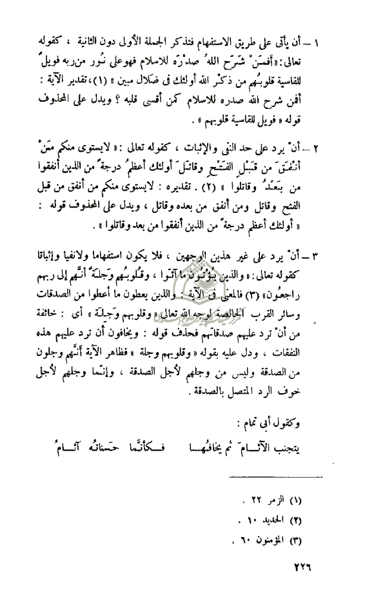 - أن يرد على حد النفى والإثبات، كقوله تعالى: «لا يَسْتَوِي مِنْكُمْ مَنْ أَنْفَقَ مِنْ قَبْلِ الْفَتْحِ وَقاتَلَ أُولئِكَ أَعْظَمُ دَرَجَةً مِنَ الَّذِينَ أَنْفَقُوا مِنْ بَعْدُ وَقاتَلُوا» (¬2). تقديره: لا يستوى منكم من أنفق من قبل الفتح وقاتل ومن أنفق من بعده وقاتل، ويدل على المحذوف قوله: