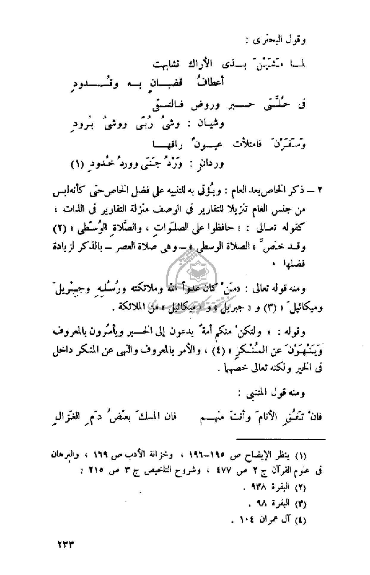 - ذكر الخاص بعد العام: ويؤتى به للتنبيه على فضل الخاص حتى كأنه ليس من جنس العام تنزيلا للتقارير فى الوصف منزلة التقارير فى الذات، كقوله تعالى: «حافِظُوا عَلَى الصَّلَواتِ، وَالصَّلاةِ الْوُسْطى» (¬2) وقد خصّ «الصلاة الوسطى» - وهى صلاة العصر- بالذكر لزيادة فضلها.