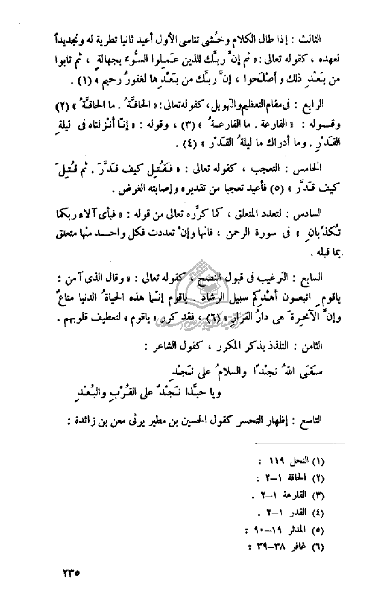 الخامس: التعجب، كقوله تعالى: «فَقُتِلَ كَيْفَ قَدَّرَ. ثُمَّ قُتِلَ كَيْفَ قَدَّرَ» (¬5) فأعيد تعجبا من تقديره وإصابته الغرض.