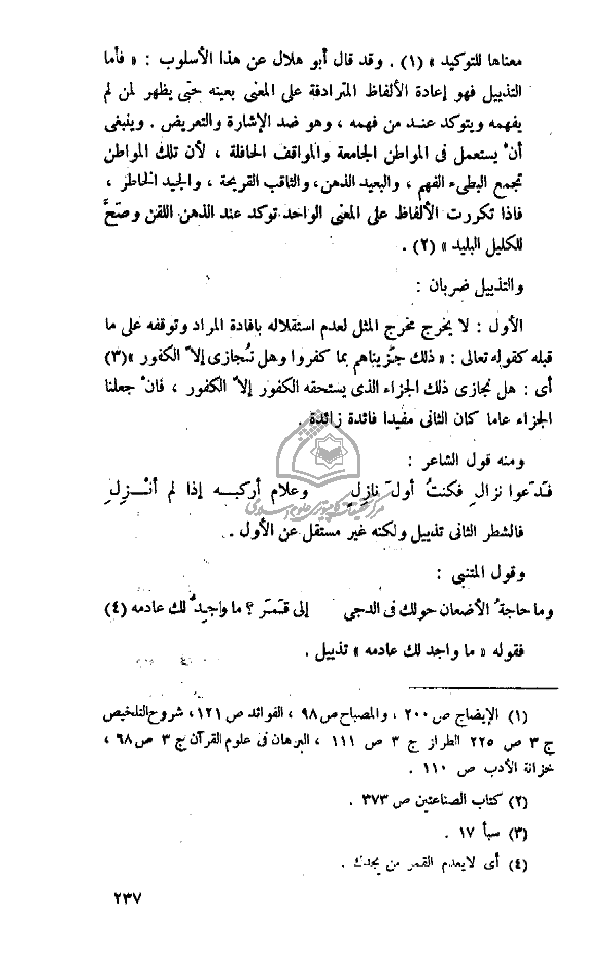 (¬1) الإيضاح ص 200، والمصباح ص 98، الفوائد ص 121، شروح التلخيص ج 3 ص 225 الطراز ج 3 ص 111، البرهان فى علوم القرآن ج 3 ص 68، خزانة الأدب ص 110.
