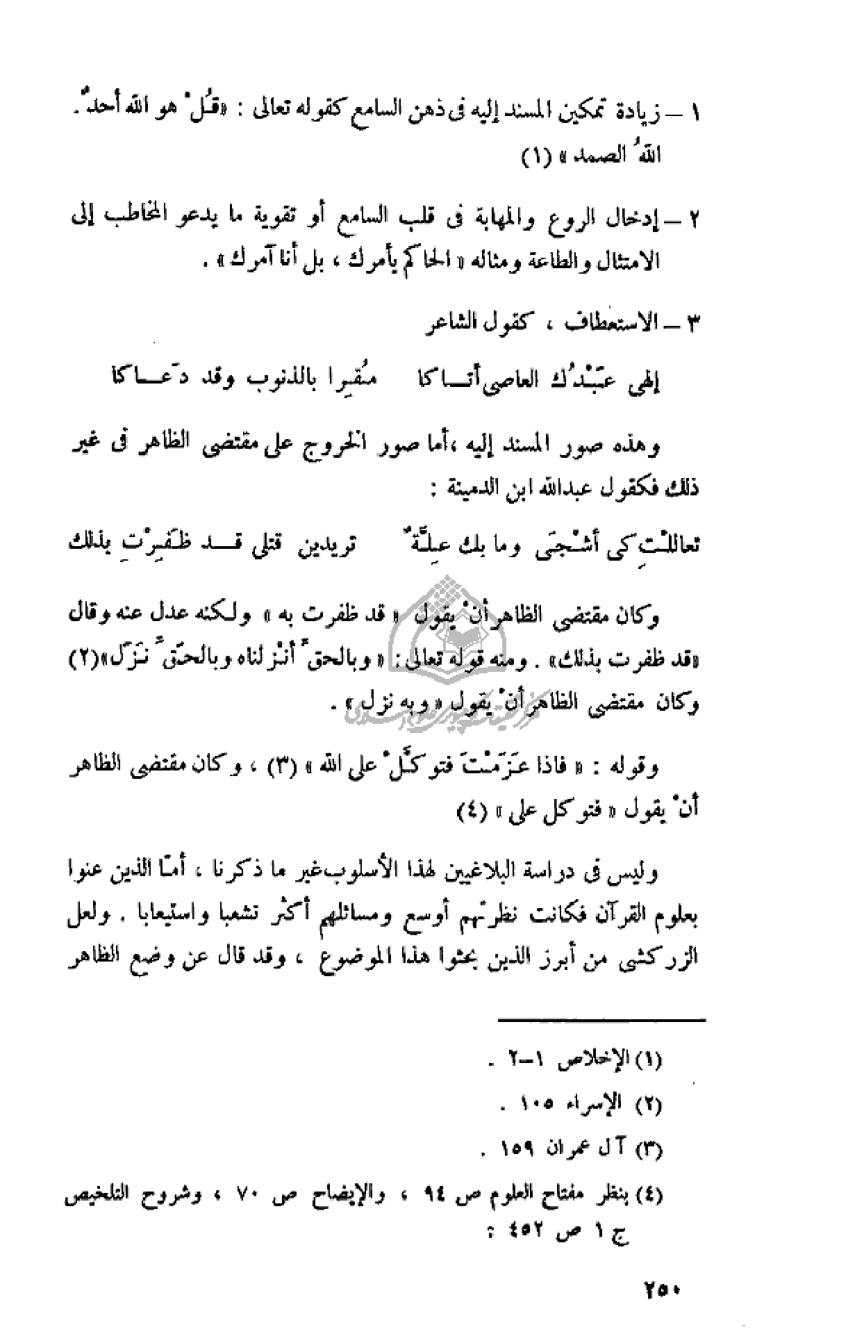 - زيادة تمكين المسند إليه فى ذهن السامع كقوله تعالى: «قُلْ هُوَ اللَّهُ أَحَدٌ. اللَّهُ الصَّمَدُ» (¬1)