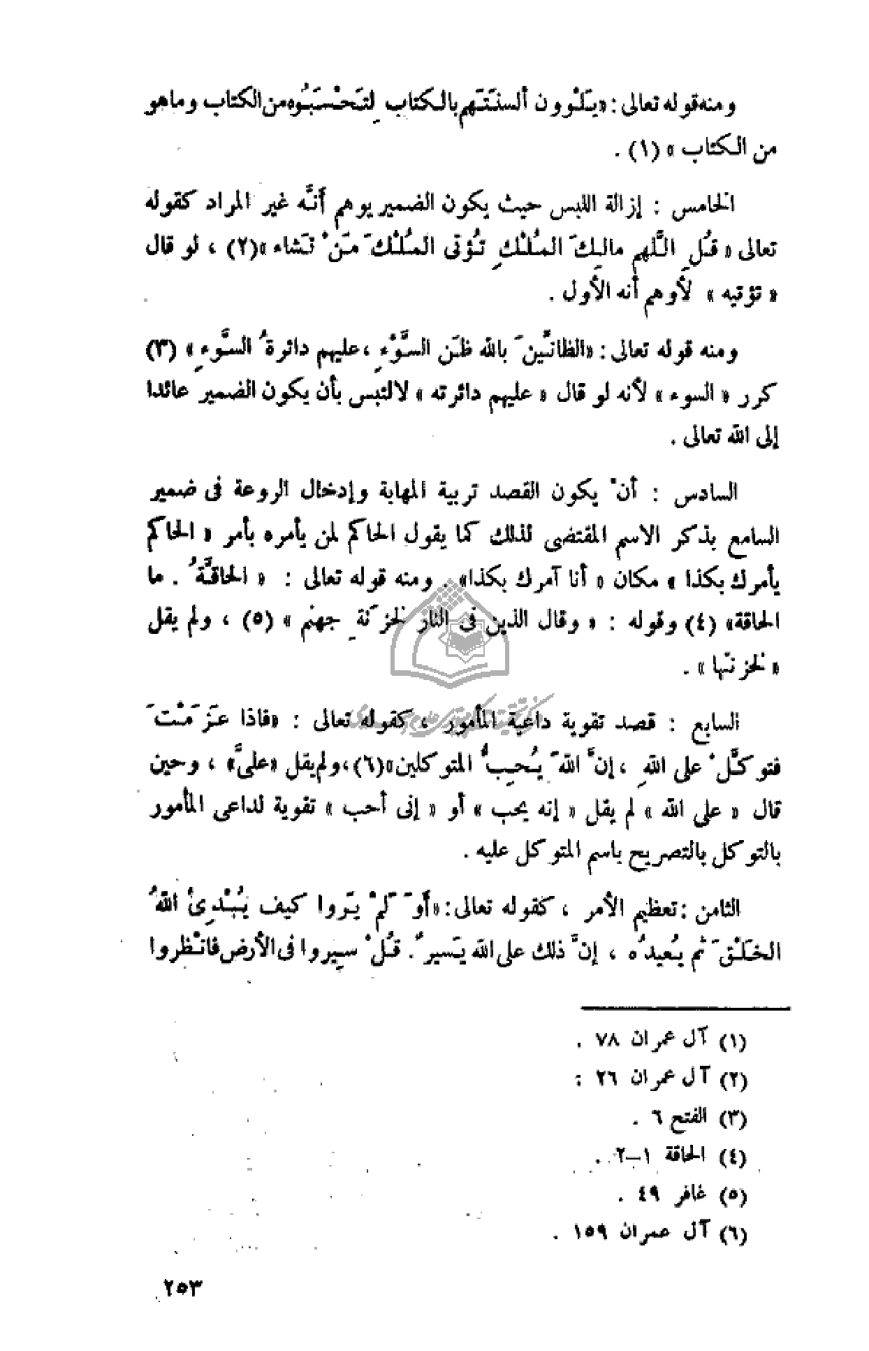 ومنه قوله تعالى: «الظَّانِّينَ بِاللَّهِ ظَنَّ السَّوْءِ، عَلَيْهِمْ دائِرَةُ السَّوْءِ» (¬3) كرر «السوء» لأنه لو قال «عليهم دائرته» لالتبس بأن يكون الضمير عائدا إلى الله تعالى.