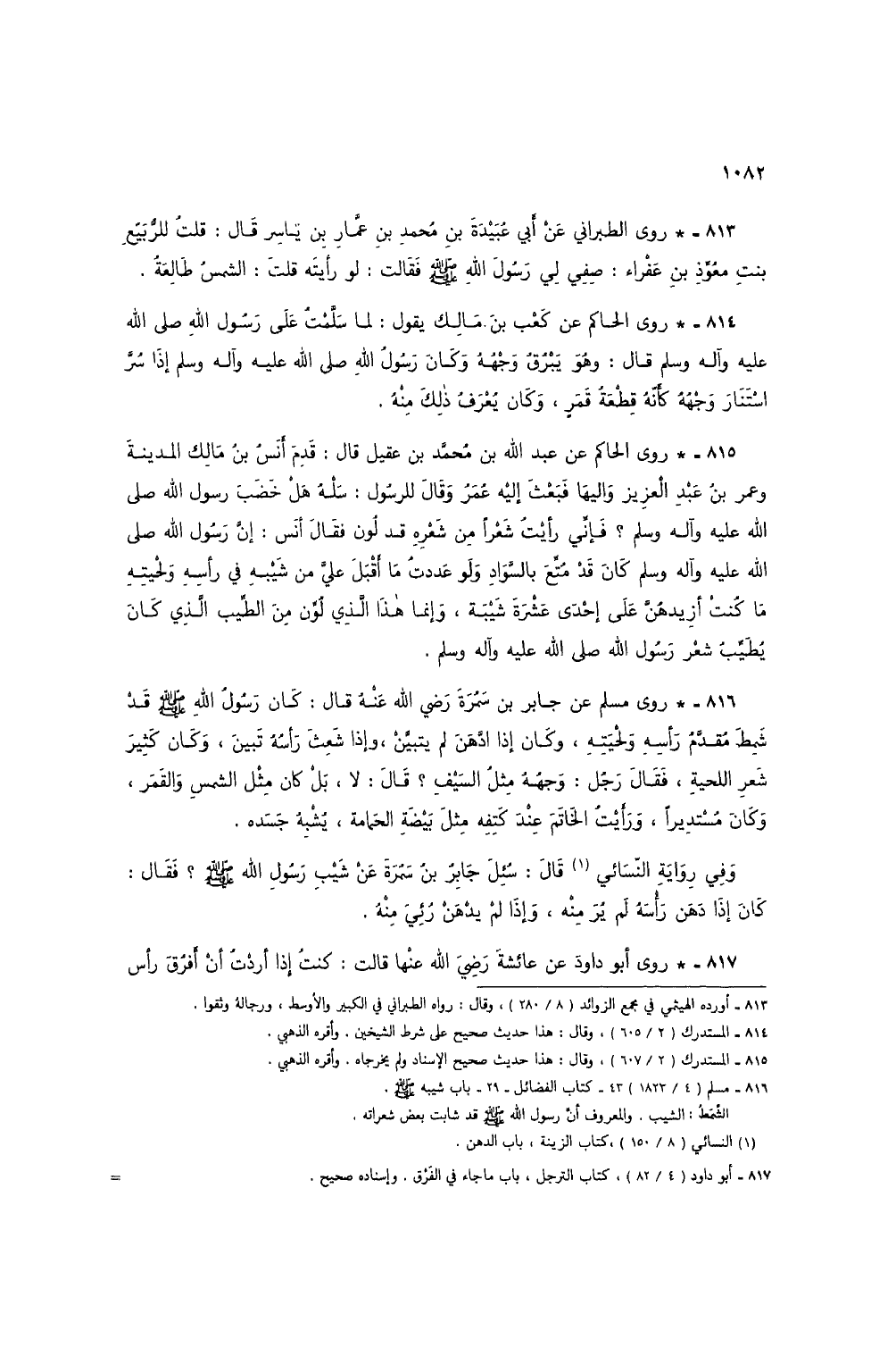 816 - * روى مسلم عن جابر بن سمرة رضي الله عنه قال: كان رسول الله صلى الله عليه وسلم قد شمِطَ مُقدمُ رأسه ولحيته، وكان إذا ادهن لم يتبين، وإذ شعث رأسه تبين، وكان كثير شعر اللحية، فقال رجل: وجههُ مثل السيفِ؟ قال: لا، بل كان مثل الشمس والقمر، وكان مستديراً، ورأيت الخاتم عند كتفه مثل بيضة الحمامة، يشبه جسده.