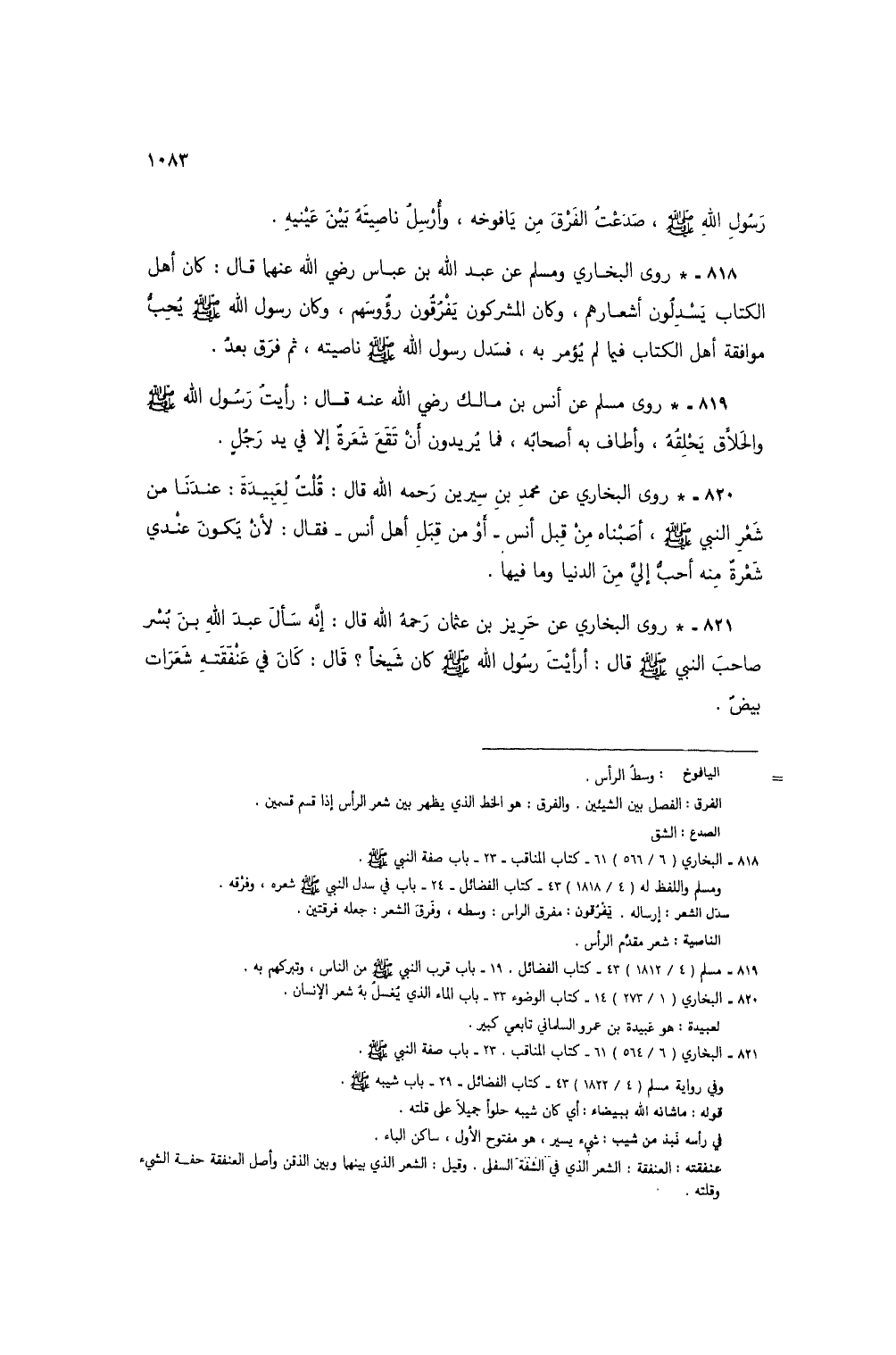 818 - * روى البخاري ومسلم عن عبد الله بن عباس رضي الله عنهما قال: كان أهل الكتاب يسدلون أشعارهم، وكان المشركون يفرُقون رؤوسهم، وكان رسول الله صلى الله عليه وسلم يُحبُّ موافقة أهل الكتاب فيما لم يؤمر به، فسدل رسول الله صلى الله عليه وسلم ناصيته، ثم فرق بعدُ.