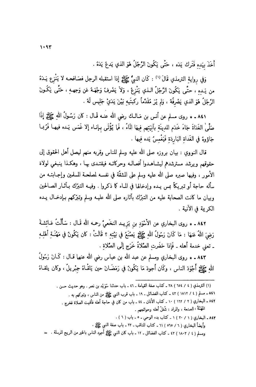841 - * روى مسلم عن أنس بن مالك رضي الله عنه قال: كان رسول الله صلى الله عليه وسلم إذا صلى الغداة جاء خدم المدينة بآنيتهم فيها الماء" فما يؤتي بإناء إلا غمس يده فيها فربما جاؤوه في الغداةِ الباردة فيغمس يده فيها.