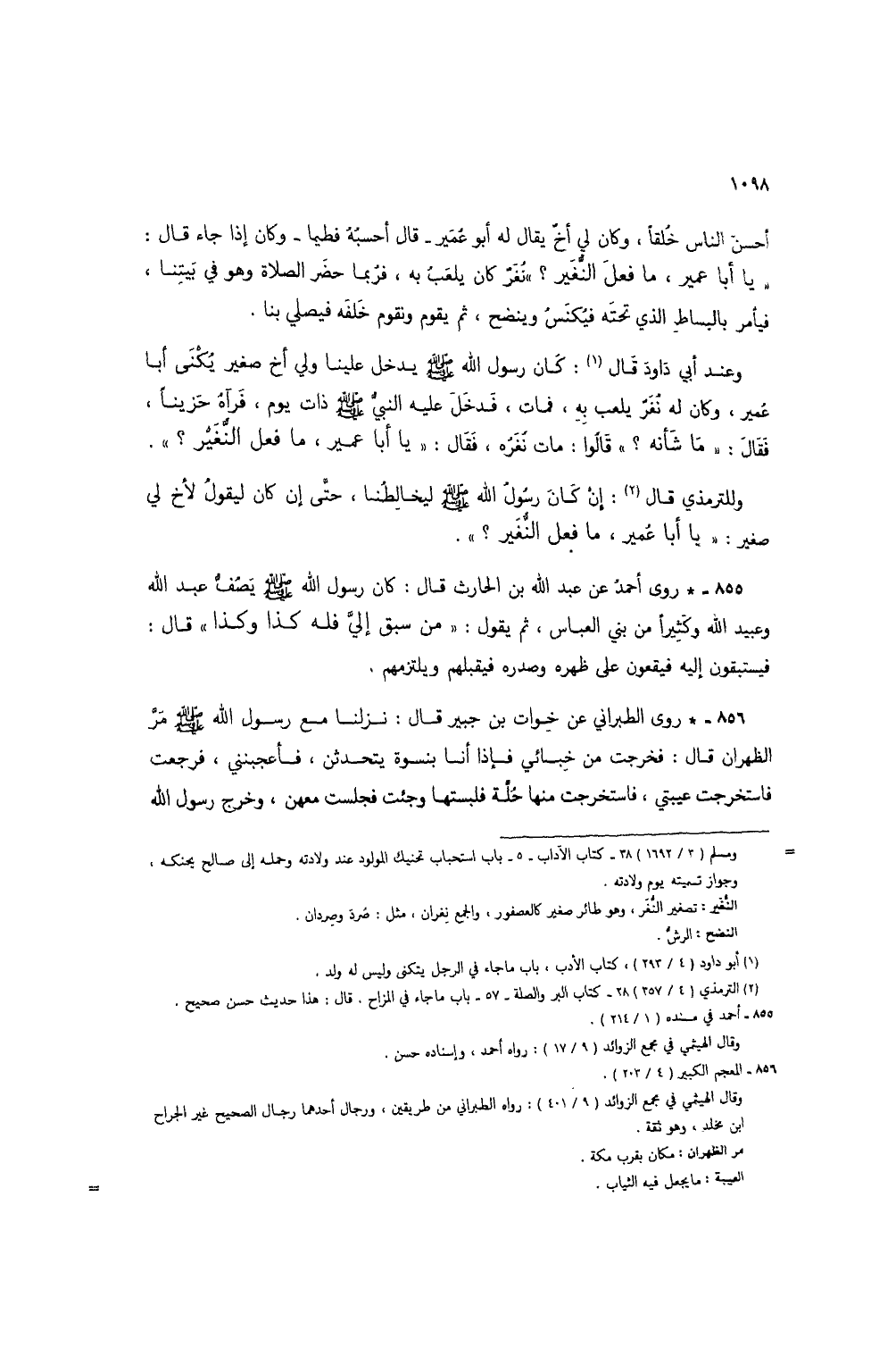 وللترمذي قال (2): إن كان رسول الله صلى الله عليه وسلم ليخالطُنا، حتى إن كان ليقول لأخ لي صغير: "يا أبا عمير، ما فعل النُّغَير؟ ".