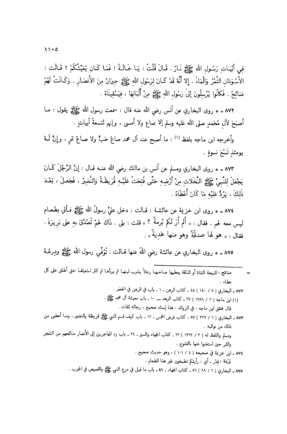 872 - * روى البخاري عن أنس رضي الله عنه قال: سمعت رسول الله صلى الله عليه وسلم يقول: ما أصبح لآلِ محمدٍ صلى الله عليه وسلم إلا صاع ولا أمسى، وإنهم لتسعةُ أبياتٍ.