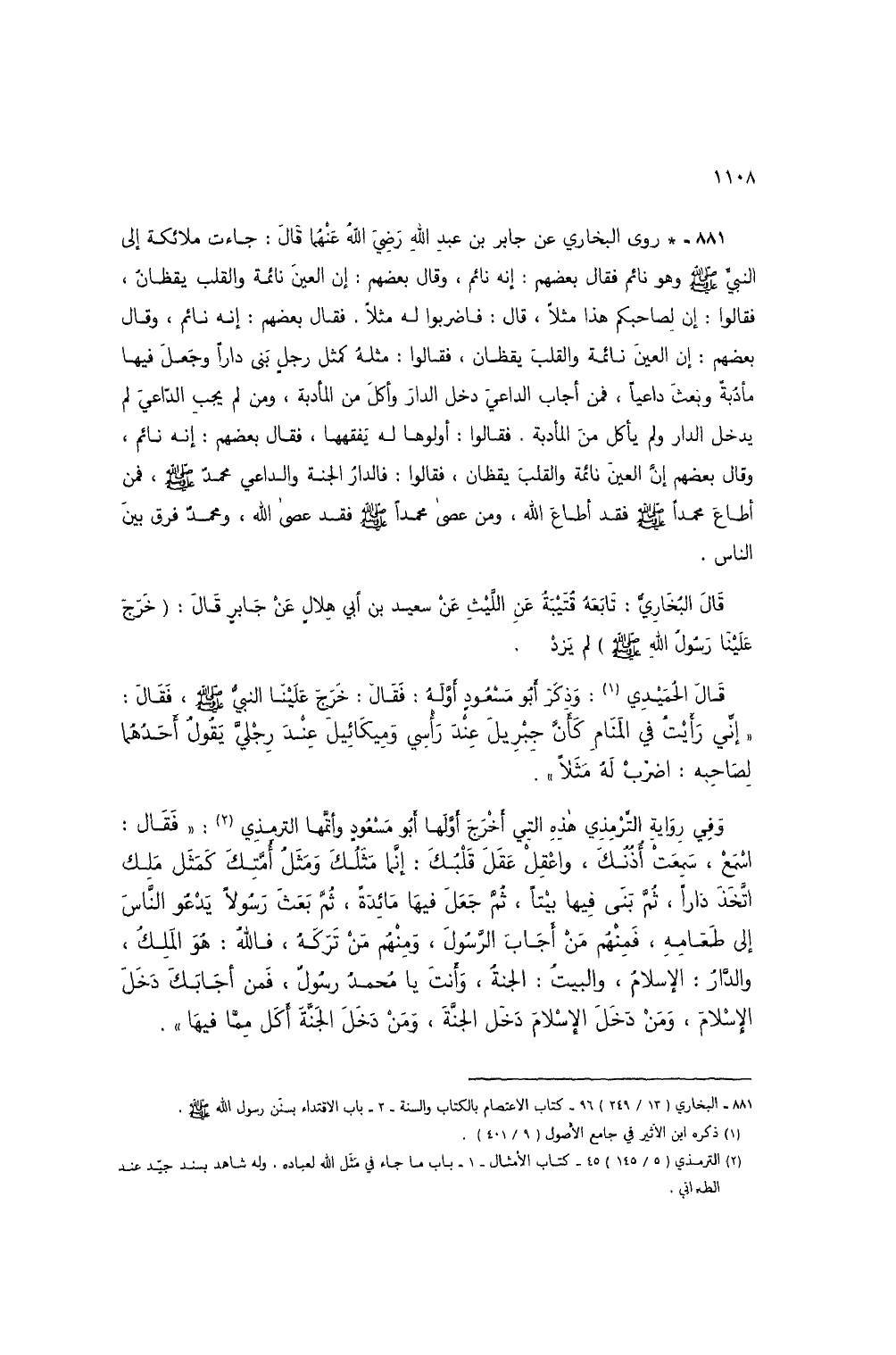 881 - * روى البخاري عن جابر بن عبد الله رضي الله عنهما قال: جاءت ملائكة إلى النبي صلى الله عليه وسلم وهو نائم فقال بعضهم: إنه نائم، وقال بعضهم: إن العين نائمة والقلب يقظان، فقالوا: إن لصاحبكم هذا مثلا، قال: فاضربوا له مثلاً. فقال بعضهم: إنه نائم، وقال بعضهم: إن العين نائمة والقلب يقظان، فقالوا: مثله كمثل رجلٍ بنى داراً وجعل فيها مأدبة وبعث داعياً، فمن أجاب الداعي دخل الدار وأكل من المأدبة، ومن لم يجب الداعي لم يدخل الدار ولم يأكل من المأدبة. فقالوا: أولوها له يفقهها، فقال بعضهم: إنه نائم، وقال بعضهم إن العين نائمة والقلب يقظان، فقالوا: فقالوا: فالدارُ الجنة والداعي محمد صلى الله عليه وسلم، فمن أطاع محمداً صلى الله عليه وسلم فقد أطاع الله، ومن عصى محمداً صلى الله عليه وسلم فقد عصى الله، ومحمد فرق بين الناس.